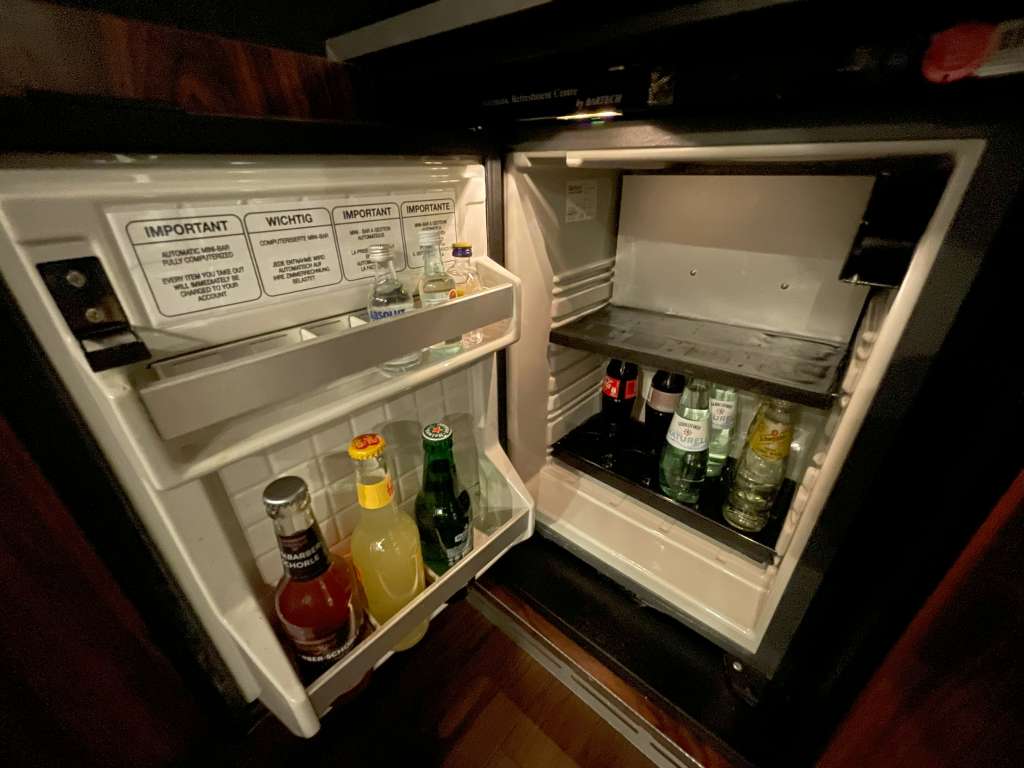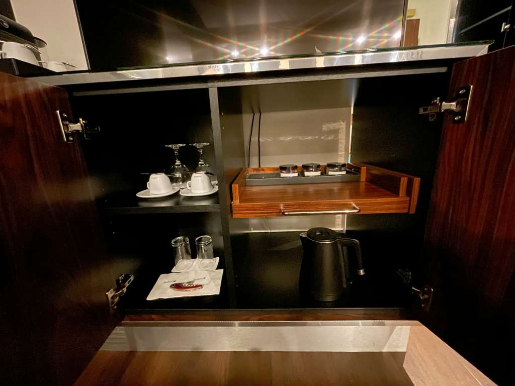 Auf einem Holzsideboard steht eine Nespresso-Maschine mit Tassen auf einem Tablett. Im Schrank befindet sich zusätzlich noch ein Wasserkocher. Die kostenpflichtige Minibar ist normal bestückt, bietet aber auch genügend Platz für selbst mitgebrachte Lebensmittel. Wie für eine Suite üblich, verfügt der Wohnbereich auch über einen eigenen Fernseher.