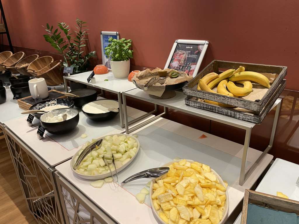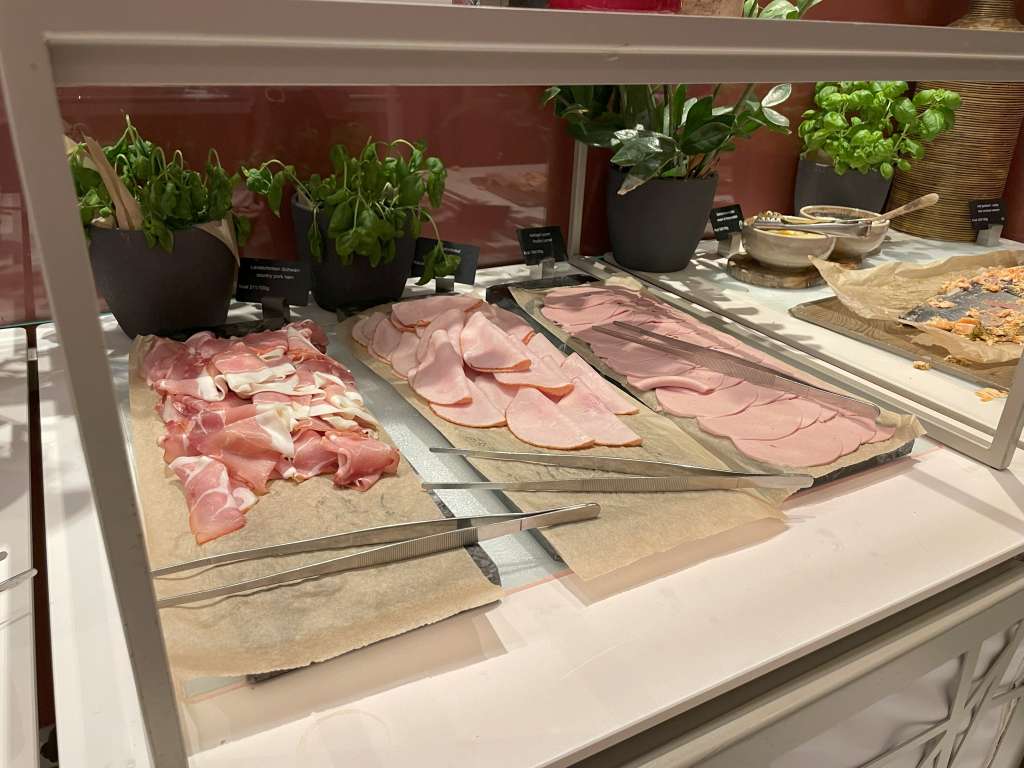 So wie sich die Gäste verhielten, sah teilweise auch das Büfett aus. Immer wieder mischten sich leere oder stark geplünderte Körbe und Teller sowie hinuntergefallenes Obst in das Gesamtbild eines sonst sehr ordentlich ausgestatteten Frühstücksangebotes. Von Brot und Brötchen über süße Backwaren bis hin zu Cerealien gab es ein ordentliches Angebot an Kohlenhydraten. Mit warmen Optionen wie Rührei, Speck und Würstchen wurde auch für den deftigeren Hunger etwas geboten. Wurstaufschnitt, Käse und Gemüse rundeten die Auswahl ab. Die wohl begehrtesten Items waren die großen Lachsplatten und Mett bzw. Hackepeter. Damit hatte mich das Radisson Hotel dann auch wieder eingefangen.