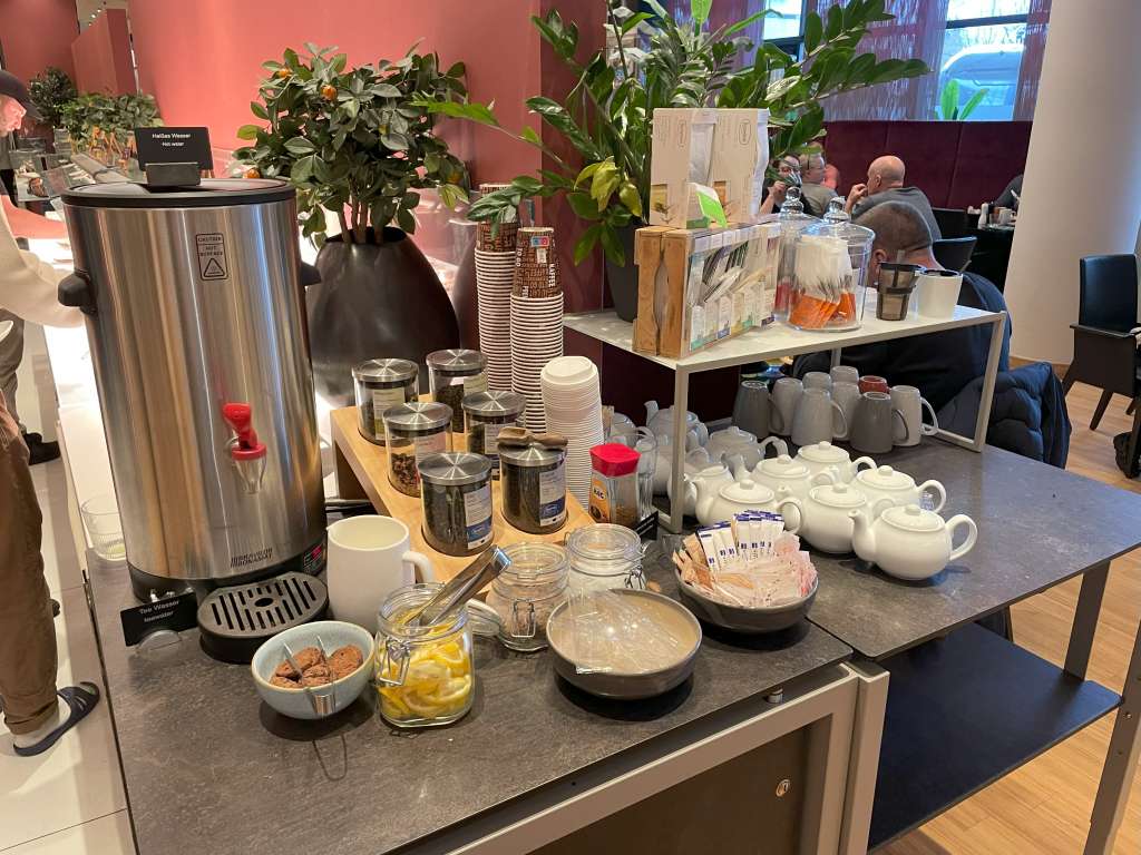 Gut gelöst war die Positionierung der Kaffeevollautomaten. Trotz des hohen Betriebs kam es hier kaum zu längeren Wartezeiten. Die Kaffeespezialitäten waren ebenso im Frühstück inkludiert wie Säfte und Tees.