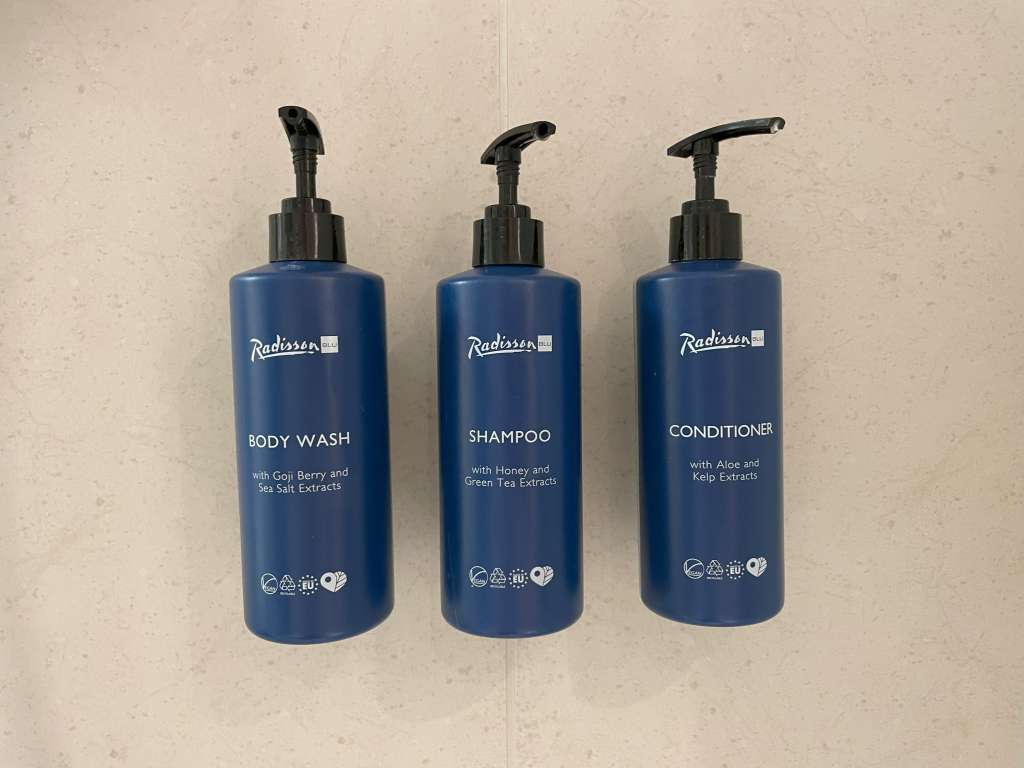 Die Dusche bietet sowohl eine Handbrause als auch eine Regendusche, und die Pflegeprodukte der Eigenmarke Radisson Blu – Body Wash, Shampoo und Conditioner mit Goji-Beere und Grüntee-Extrakten – stehen in großen Spendern bereit. Ein schwarzes Regal mit Handtüchern sorgt für praktischen Stauraum, während die Beleuchtung durch Einbauspots angenehm hell ist.