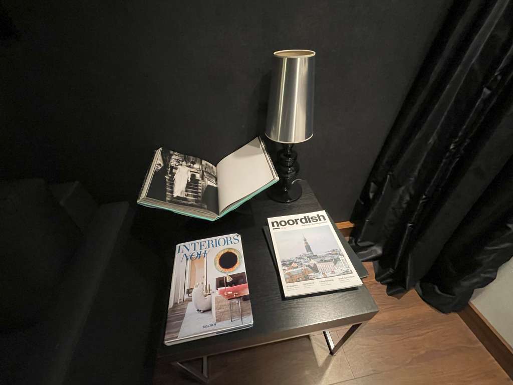 Das Schlafzimmer setzt den modernen Stil des Wohnbereichs fort: Dunkle Holzböden, ein großes Bett mit einem stilvollen Holz-Kopfteil und graue Wände schaffen eine ruhige Atmosphäre. Das Bett – zwei zusammengeschobene Einzelbetten – war ausreichend bequem, auch wenn die Bettritze in der Mitte etwas stört. Zwei Nachttische mit Lampen und ein kleiner Sessel in der Ecke runden den Schlafbereich ab, während ein blauer Teppich für etwas Gemütlichkeit sorgt.