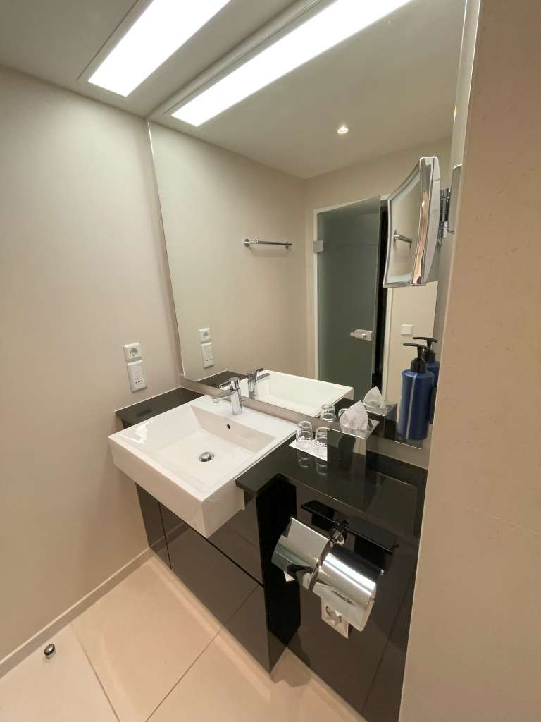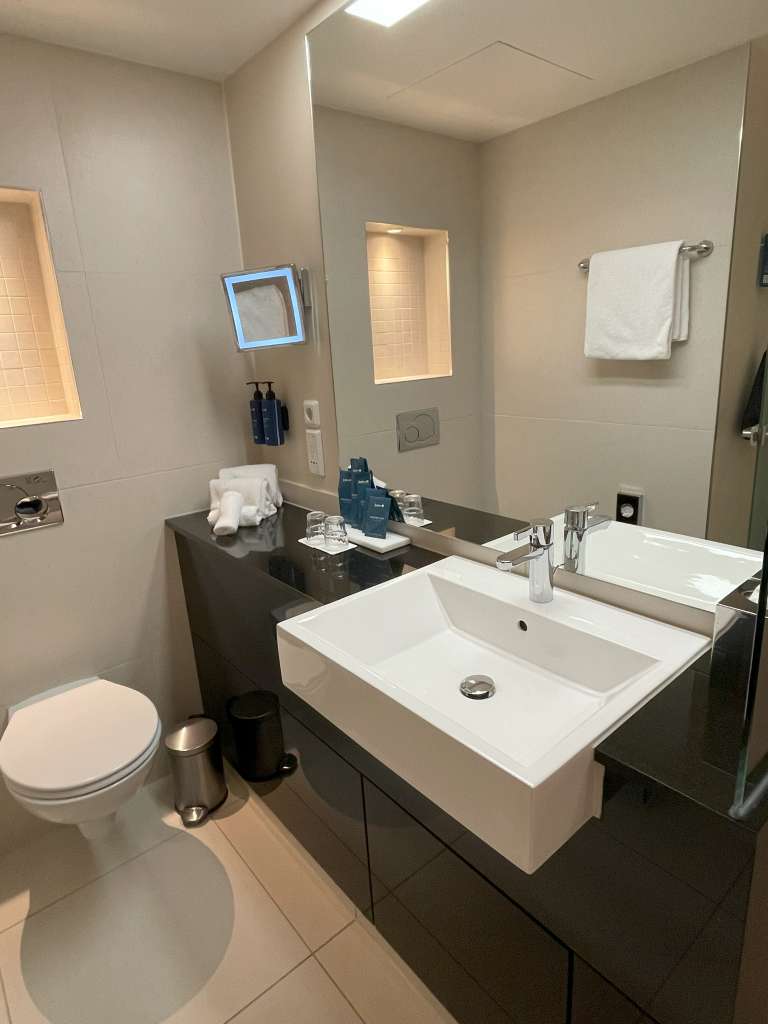 Der Waschtisch aus schwarzem Granit bietet viel Platz, ein großer Spiegel mit beleuchtetem Schminkspiegel daneben ist ein nettes Extra. Neben dem Waschbecken stehen zwei Gläser, Handtücher und ein Set mit Amenities wie Duschhaube, Rasier- und Dental-Kit. Selbst Badesalz gab es für ein entspannendes Bad.