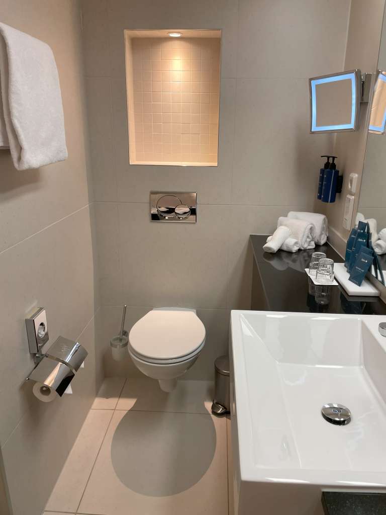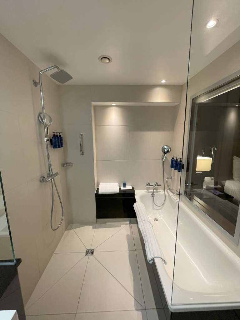 Das Badezimmer der Suite ist etwas gewöhnungsbedürftig: Denn Dusche und Badewanne sind in einem zusammenhängenden Teil des Badezimmers untergebracht. Wer in die Badewanne einsteigen möchte, muss durch die Dusche gehen. Wer duscht, macht gleichzeitig die Badewanne nass. Das ist kein Problem, wirkt nur beim ersten Eindruck ungewohnt.