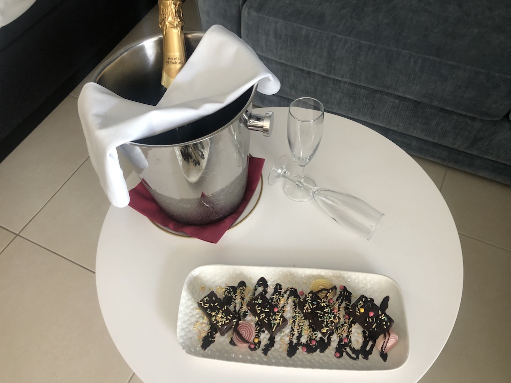Als Aufmerksamkeit (bzw. Geschenk für Gold-Kunden) wurde am Tag der Ankunft eine Flasche Cava und Kuchen auf das Zimmer geliefert. Die Wasserflaschen werden erst ab der Premium-Kategorie täglich gebracht, sonst nur 1x / Aufenthalt.