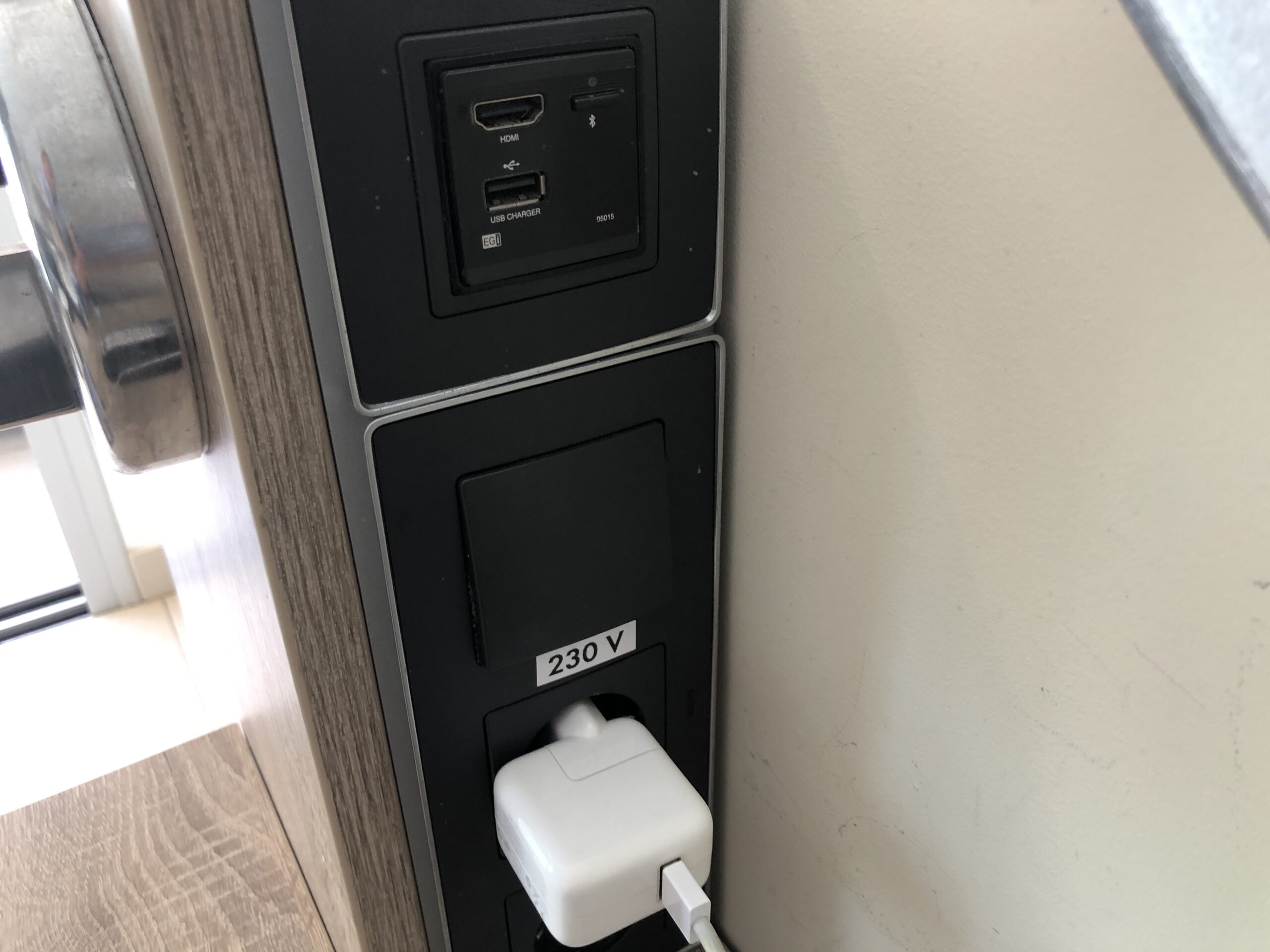 Den Fernseher kann man auch über das eigene Smartphone steuern, am Schreibtisch sind Schnittstellen um persönliche Geräte anzuschließen. An Steckdosen mangelt es auch sonst nicht.