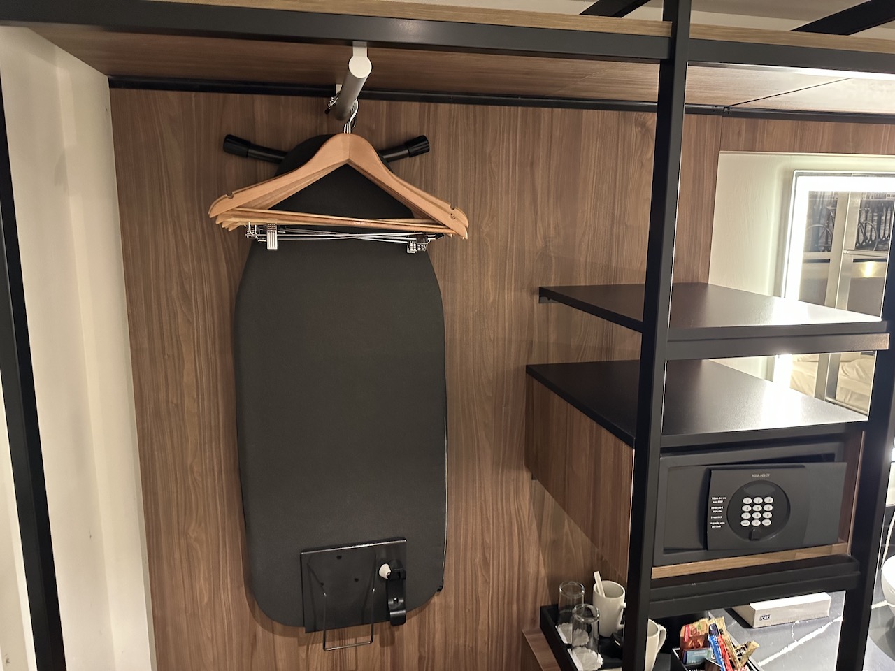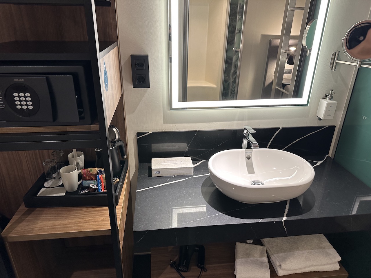Während die Größe des Raumes absolut in Ordnung war, waren einige Dinge durchaus merkwürdig. Um in das Zimmer zu kommen, geht man quasi zunächst durch das Bad, dort befinden sich auch Garderobe, Safe, Kühlschrank und Wasserkocher.
