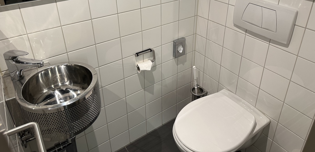 Das WC ist in einem kleinen separaten Raum, wobei die kleine Zelle mit Edelstahlbecken nicht wirklich einladend wirkt.