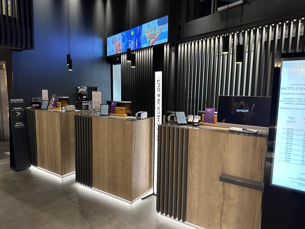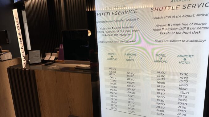 Ich bin nach der Buchung fälschlicherweise in das nahegelegene Radisson BLU direkt am Terminal gelaufen, dort ist mir dann aufgefallen dass ich in der Eile das andere Hotel der Kette reserviert hatte. Der Shuttlebus fährt aber regelmäßig, die Fahrt zum Hotel dauert gut 10 Minuten und ist kostenlos. Für den Rückweg ist eine Reservierung erforderlich, die Fahrt zum Terminal wird zudem mit 8 CHF berechnet. Auf dem Rückweg machten wir einen Stopp bei einem anderen Hotel, was die Fahrzeit verlängerte.