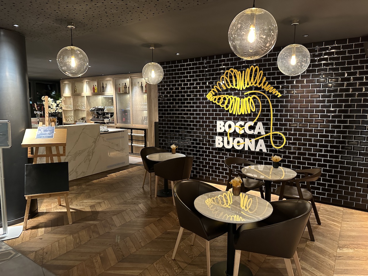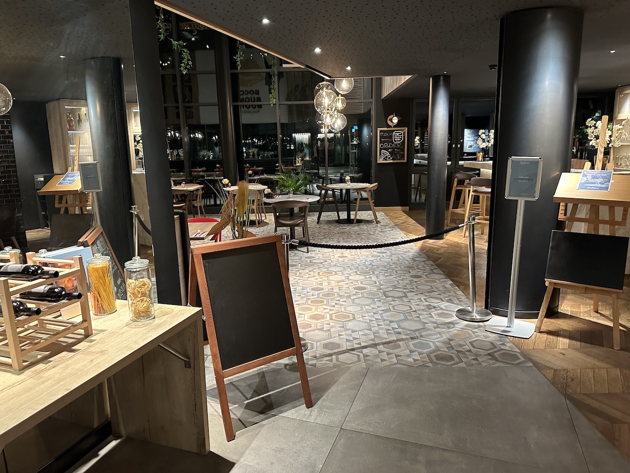 Das Restaurant ist auf der selben Ebene direkt neben der Rezeption. Die dortige Bar war bei meiner Ankunft am Abend bereits vor Mitternacht geschlossen, beim Check-Out um 6 Uhr morgens gab es auch noch kein Frühstück.