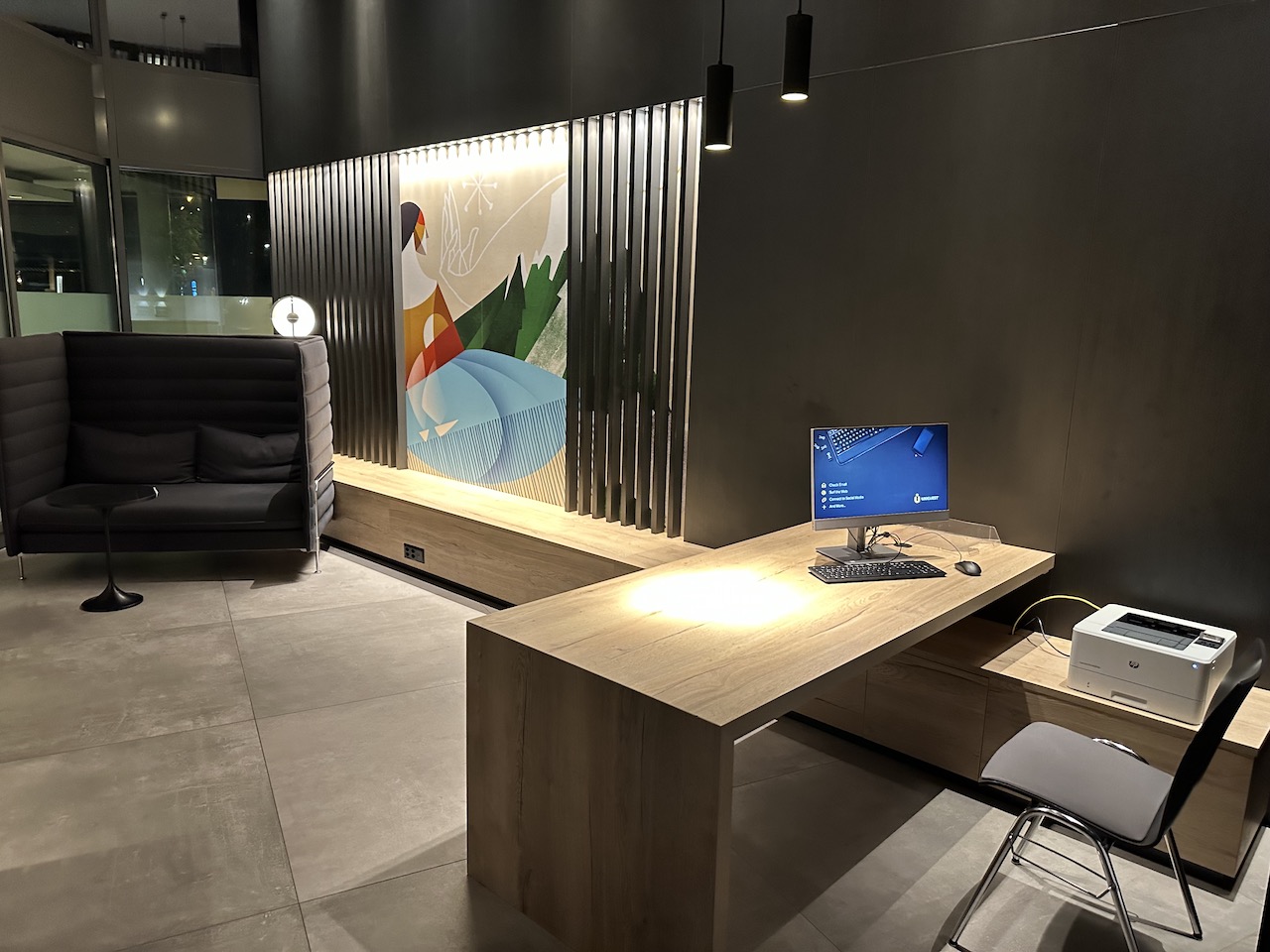 In der Lobby gibt es mehrere Sitzgelegenheiten sowie einen Schreibtisch mit Computer.