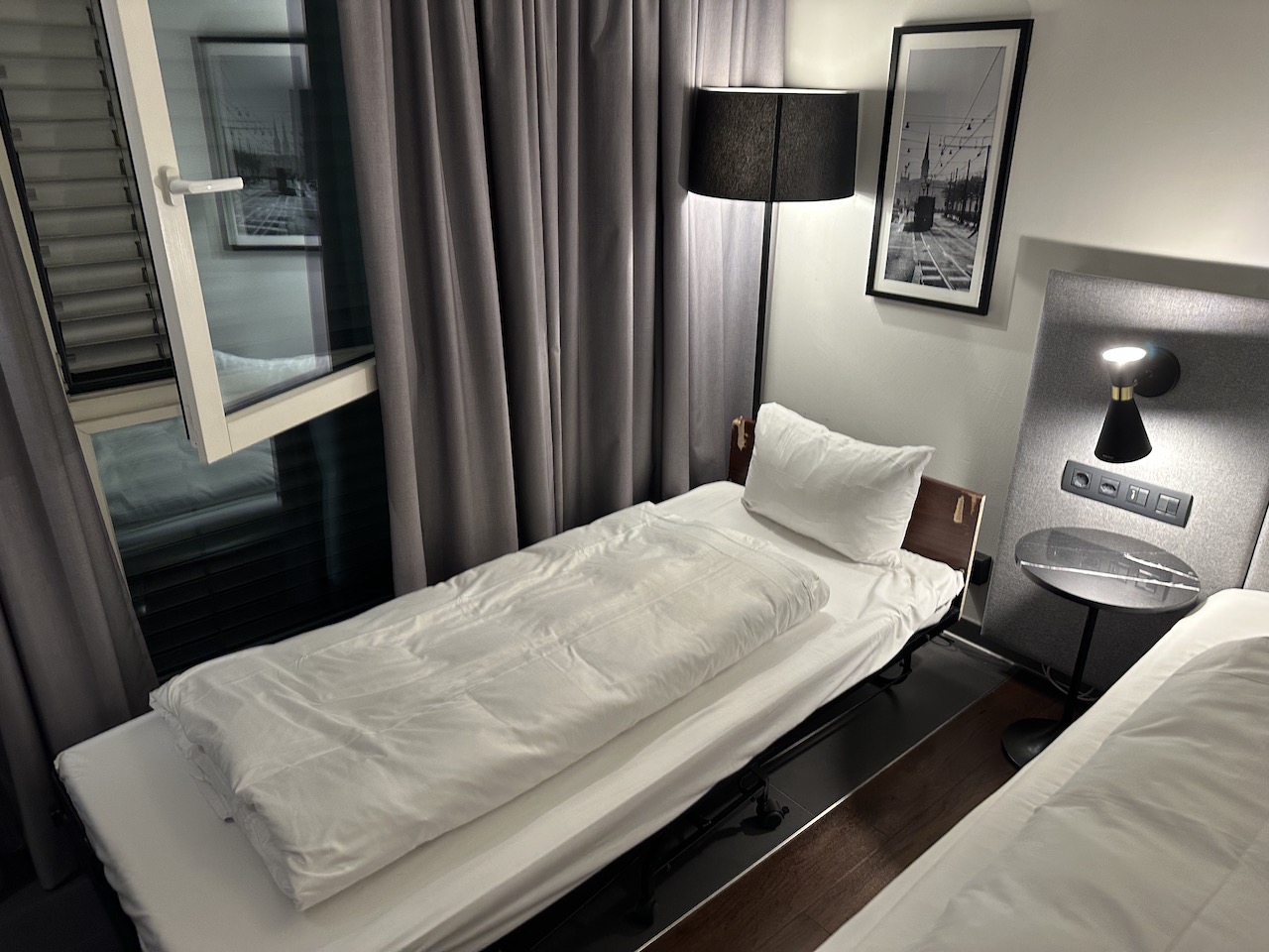 Neben dem Doppelbett war noch ein extra Zustellbett im Zimmer, dieses versperrte den Zugang zum Fenster und verkleinerte den Raum unnötigerweise.