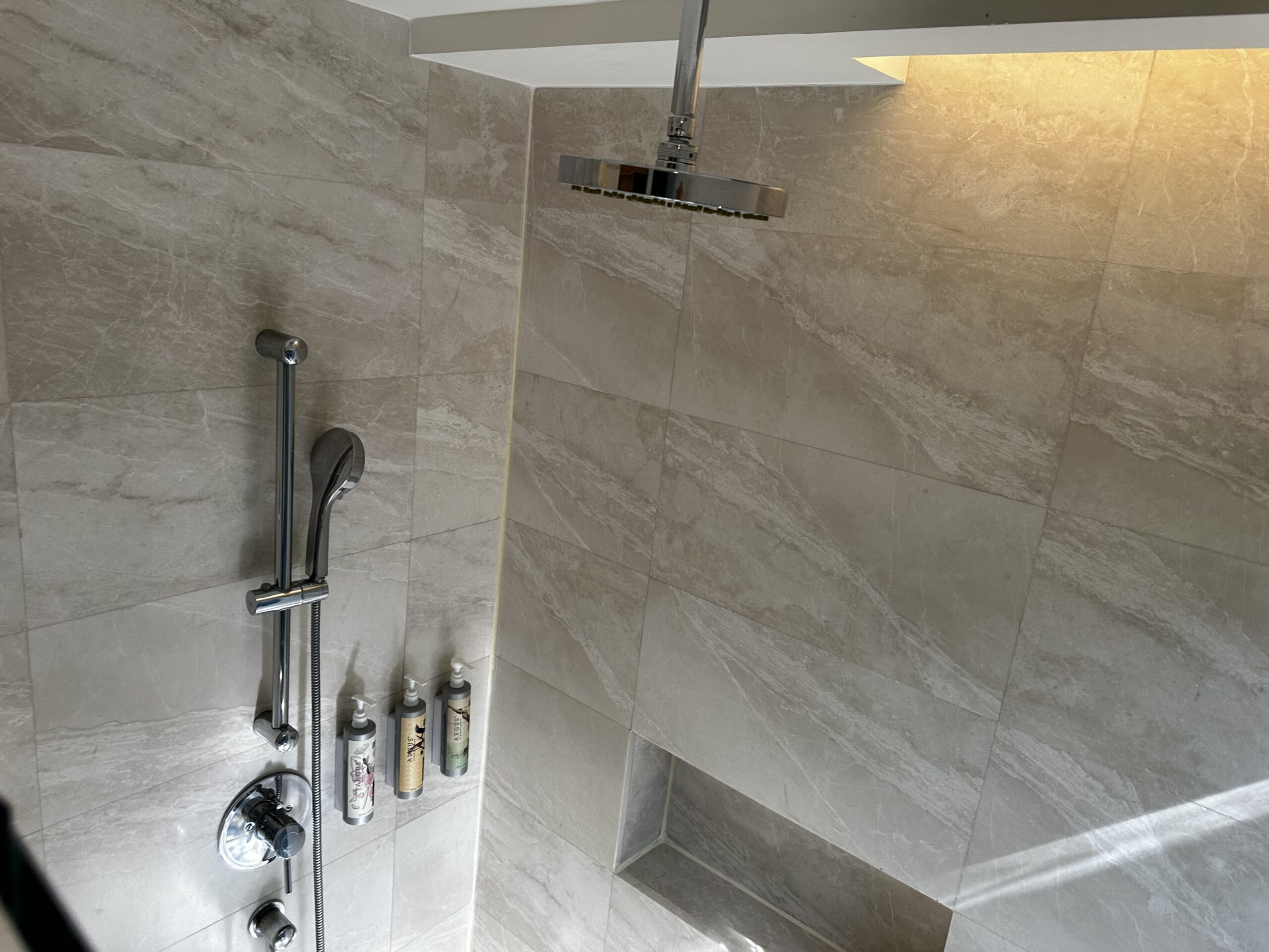 Das Bad ist stattlich und bietet eine große Wanne sowie eine riesige Dusche.