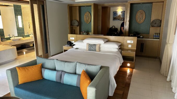 Nur wenige Minuten nach dem Eintreffen im Hotel wurden wir schon von einem Mitarbeiter gesucht, der uns darüber informierte, dass das Zimmer bereit ist. Gebucht hatte ich ein reguläres King-Zimmer, diese sind im Hauptgebäude des Hotels. Dort sind auch Suiten verfügbar, höchste Kategorien sind die Villas. Wir hatten ein solches Haus als Upgrade erhalten.