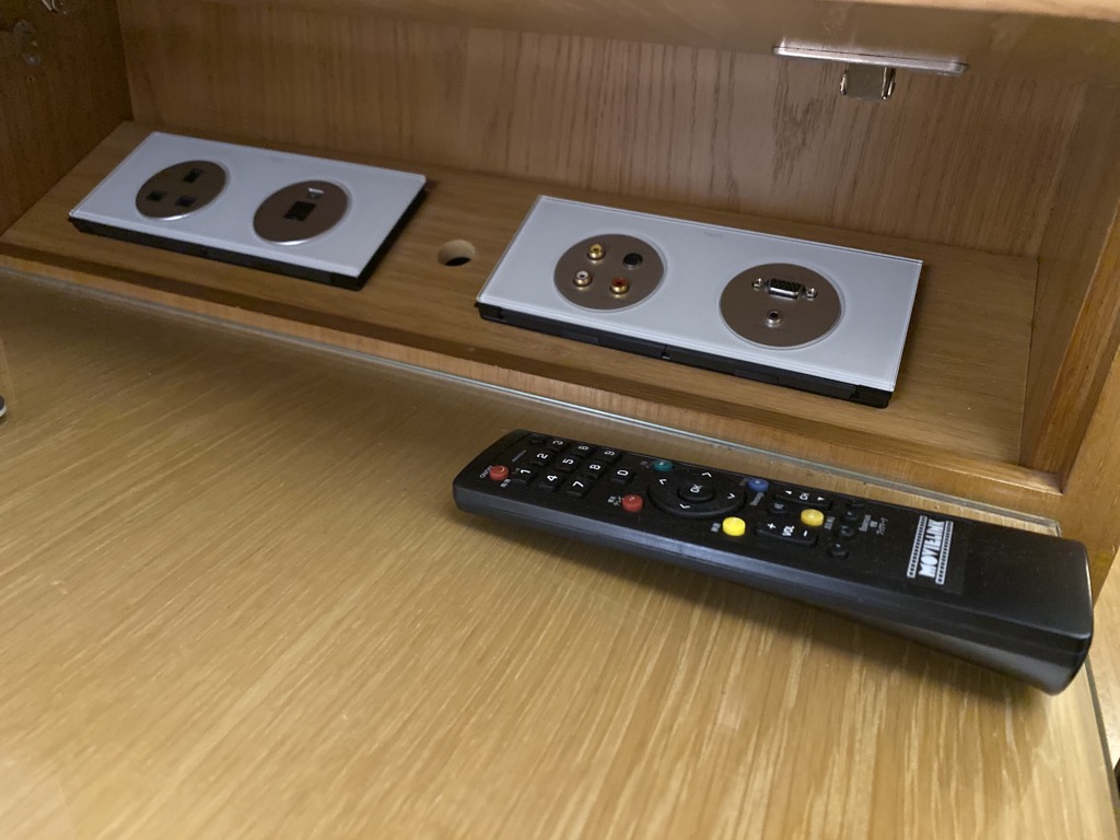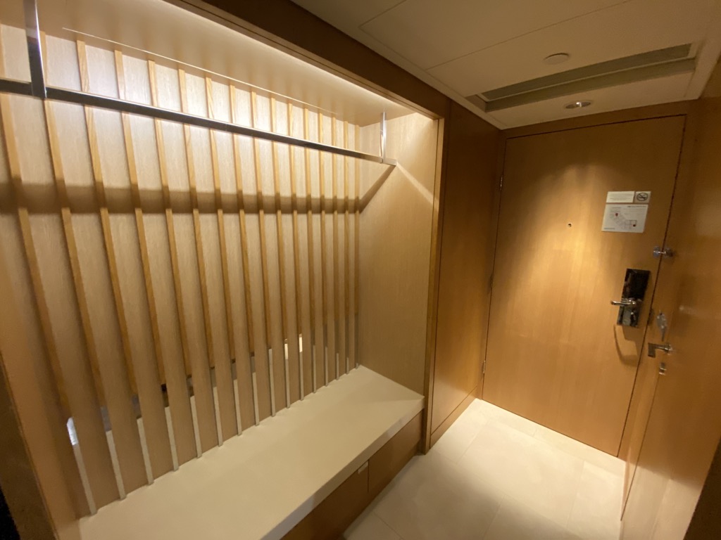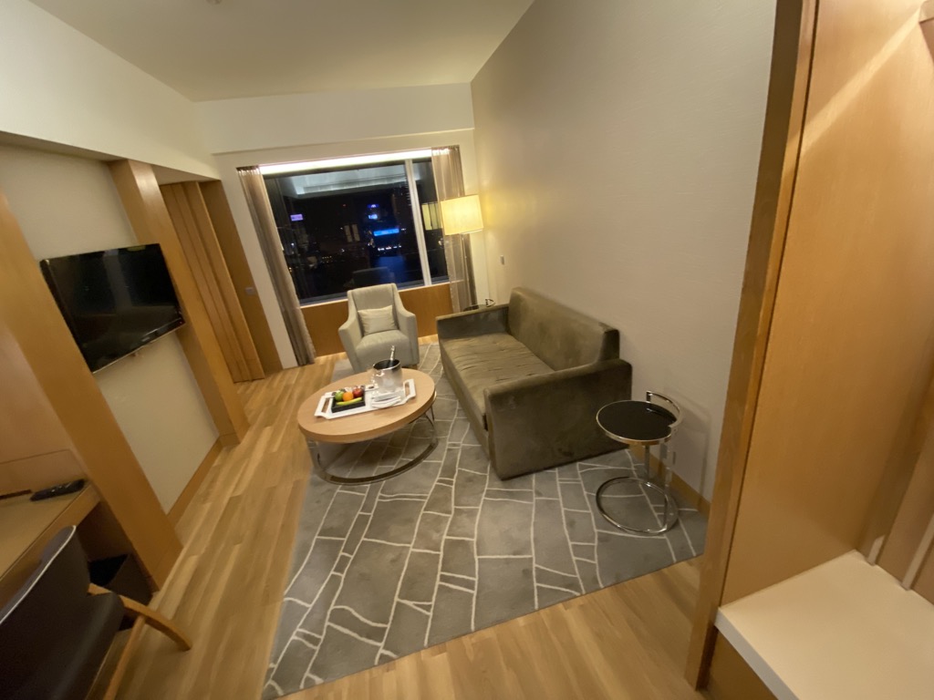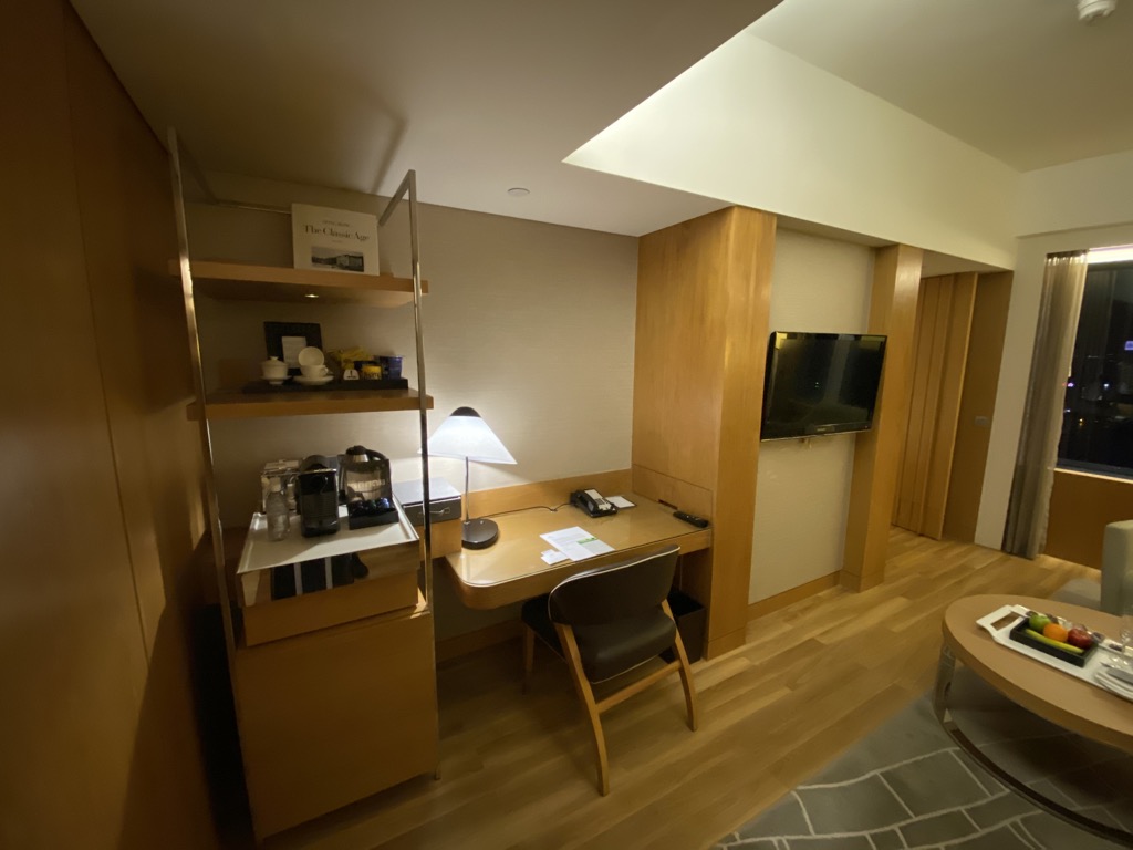 Unsere Suite befand sich auf deiner der höheren Etagen. Nach dem Betreten auf der linken Seite, befand sich direkt das WC, gegenüber war eine große Garderobe verbaut. Im Wohnzimmer stand zudem ein Schreibtisch, neben dem die Minibar und die Kaffee- und Teestation untergebracht war. Am Schreibtisch konnte man alle Geräte laden, denn hier waren diverse Steckdosen und USB Anschlüsse untergebracht.