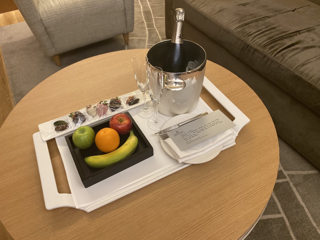 Der Raum wurde durch eine Sitzgruppe mit Couchmöbeln und einem Beistelltisch ergänzt. Hier begrüßte uns bereits eine Flasche Sekt und ein Obstteller. Eine wirklich tolle Begrüßung vom Hotel, über die wir uns gefreut haben.