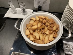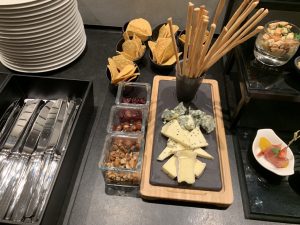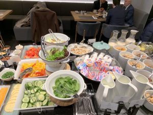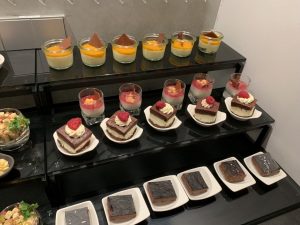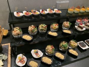 Am Abend gibt es in der Club Lounge ein recht umfangreiches Buffet, insbesondere wenn man bedenkt für wie wenige Personen dies angeboten wird. Hier gab es neben drei warmen Gerichten auch kleine Salate, Käse und Kuchen.