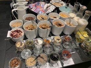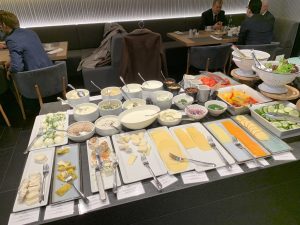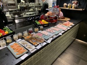 Das Frühstück im Restaurant wurde auf mehreren kleinen Buffets serviert und in der offenen Küche konnte man sich auch frische Eierspeisen, Waffeln und Pfannkuchen bestellen. Dabei war das Angebot auf dem Buffet bereits sehr umfangreich und auch hochwertig. Vermisst habe ich hier wirklich nichts, was bei mir eher selten vorkommt.