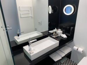 Das Badezimmer war wie das Zimmer selbst modern und sauber, allerdings auch nicht übertrieben groß. Ich würde es als funktional beschreiben, wobei man hier alles hatte was man benötigt, inkl einer  Regenwalddusche. Auch die von mir am Morgen über die Marriott App bestellten Rasierer und Zahnbürsten lagen bereits im Bad, was nicht in jedem Hotel funktioniert.