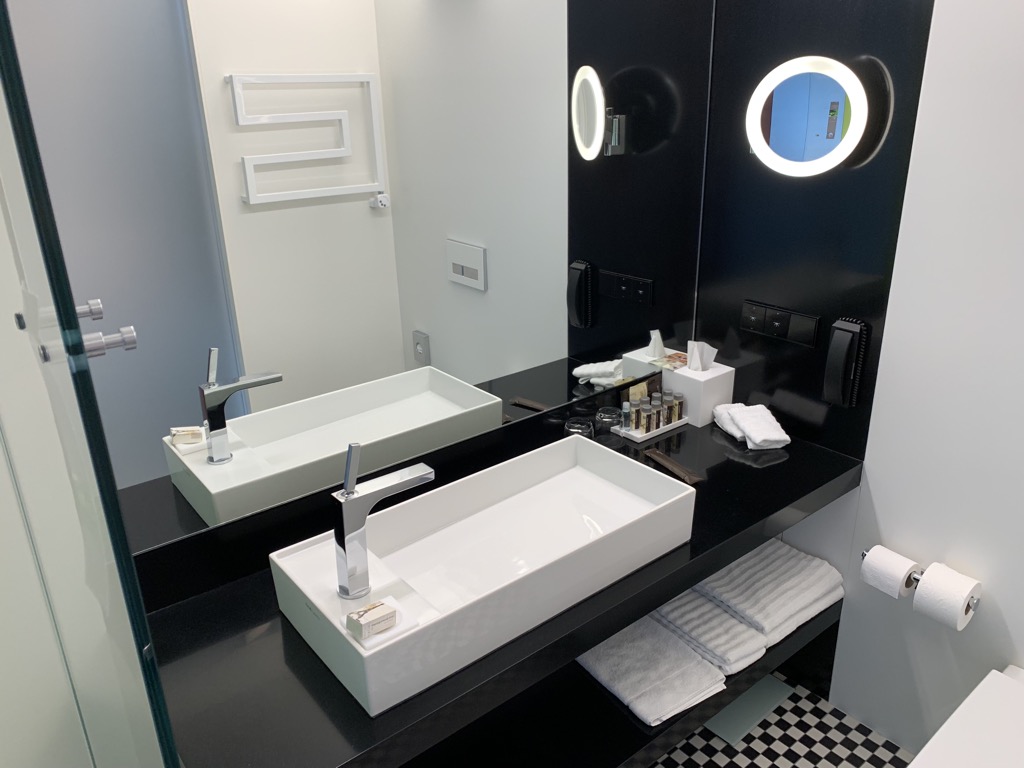 Das Badezimmer war wie das Zimmer selbst modern und sauber, allerdings auch nicht übertrieben groß. Ich würde es als funktional beschreiben, wobei man hier alles hatte was man benötigt, inkl einer Regenwalddusche. Auch die von mir am Morgen über die Marriott App bestellten Rasierer und Zahnbürsten lagen bereits im Bad, was nicht in jedem Hotel funktioniert.