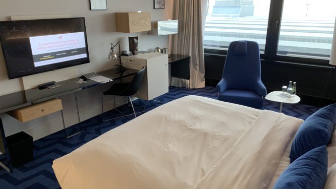 Nachdem ich vom Flugzeug bis zum Hotel nur knapp 10 Minuten gebraucht habe und der Check-In auch binnen Sekunden erledigt war (nachdem ich bereits am Morgen den eCheck-In über die App gemacht habe), war ich weniger als 15 Minuten nach der Landung bereits auf meinem Zimmer und konnte theoretisch sogar noch mein Flugzeug aus Frankfurt am Gate stehen sehen.