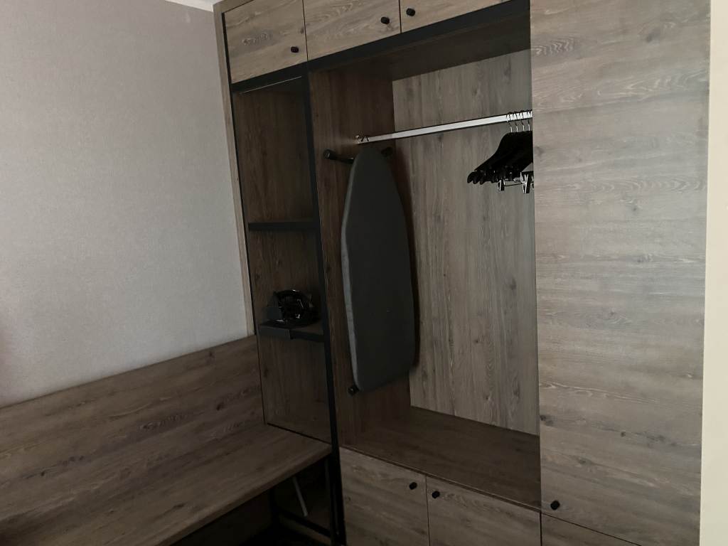 Jeweils eine Schiebetür führen ins Bad und in den Schlafbereich. Im Schlafzimmer dominiert das Queensize-Bett, welches gegenüber einem zweiten Flachbildfernseher an der Wand steht. Da das Studio für Langzeitaufenthalte geplant ist, fanden wir hier auch großzügige Schränke und Bügelbrett mit Bügeleisen.