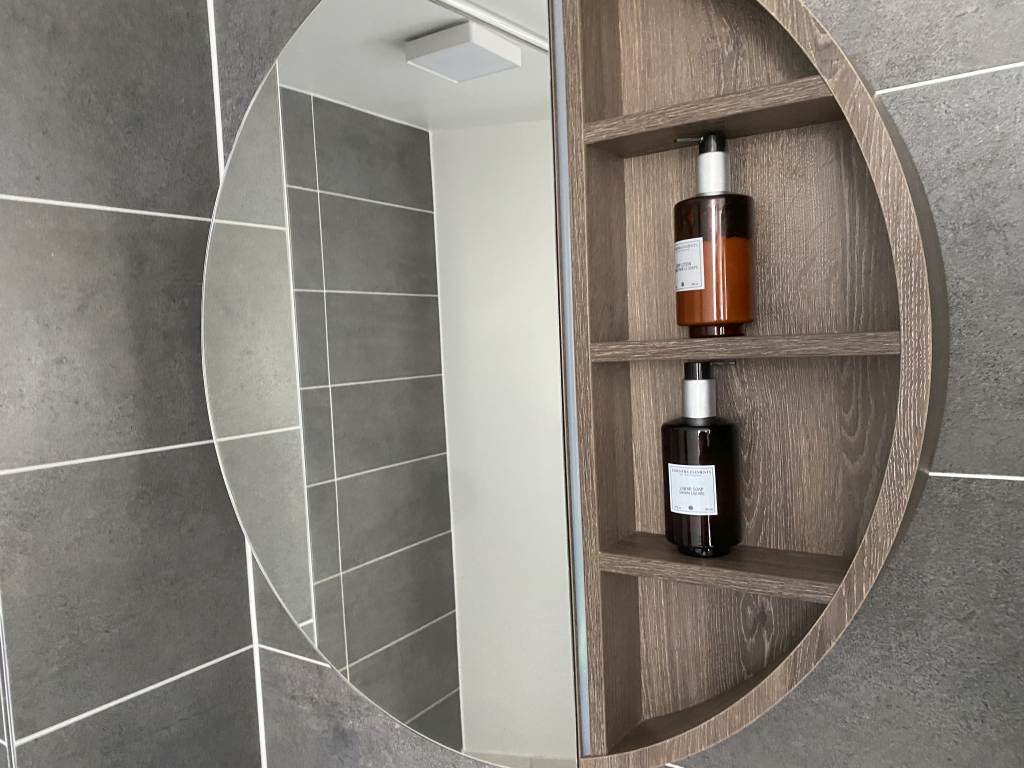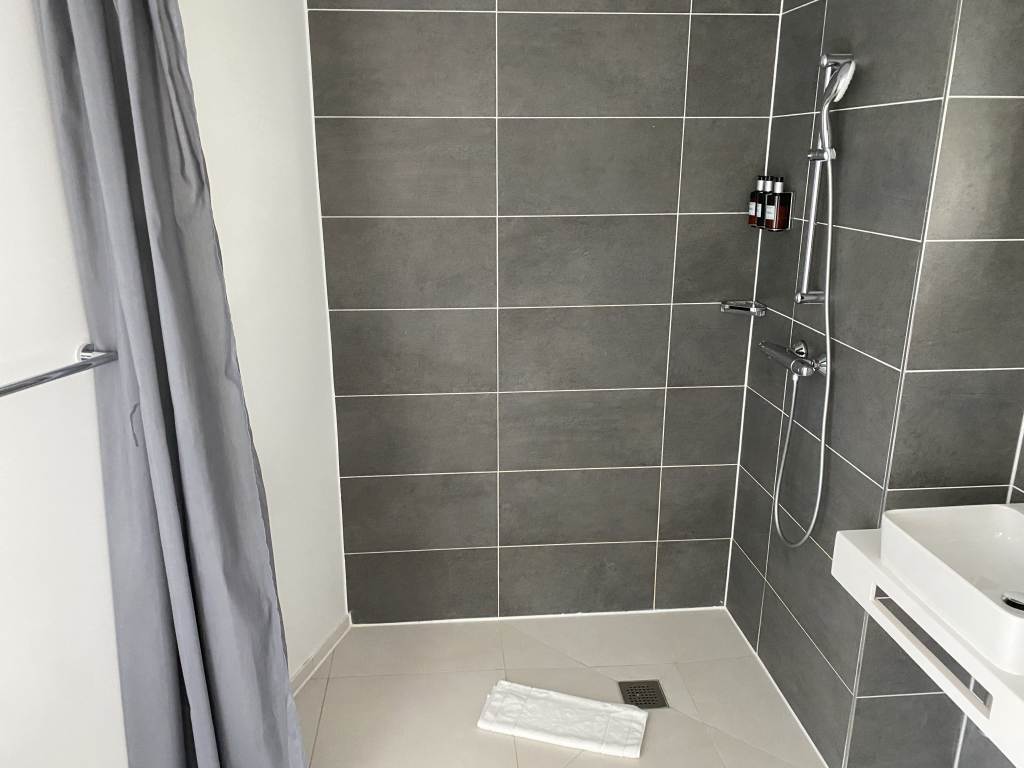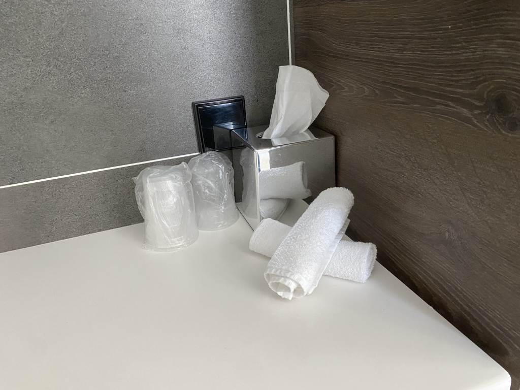 Ebenso großzügig wie der Rest des Studios ist das Badezimmer, welches neben dem WC und einem Waschtisch auch über eine begehbare Dusche verfügt. Wenn es ein Manko gibt, dann dass diese nur mit Duschvorhang ausgestattet ist. Eher unüblich, aber hier absolut sinnvoll: Auch das Badezimmer verfügt über einen Schrank, in dem Handtücher und Badartikel untergebracht werden können. Statt kleiner Shampoo- und Duschgel-Fläschchen setzt man im Residence Inn auf größere Spender.