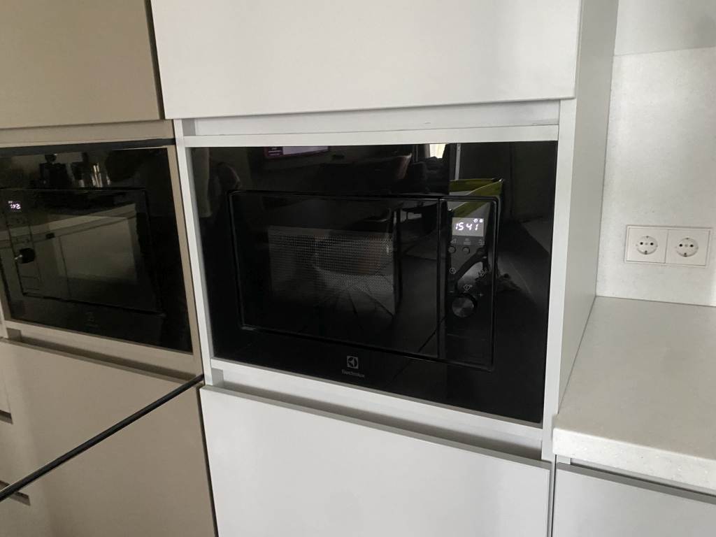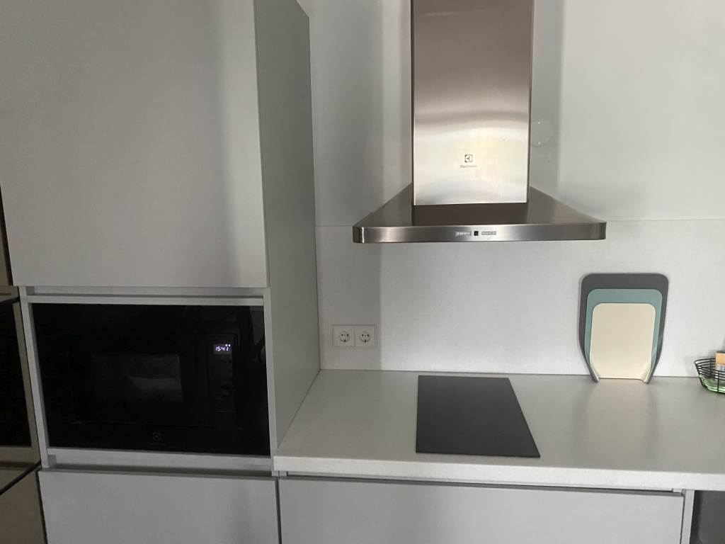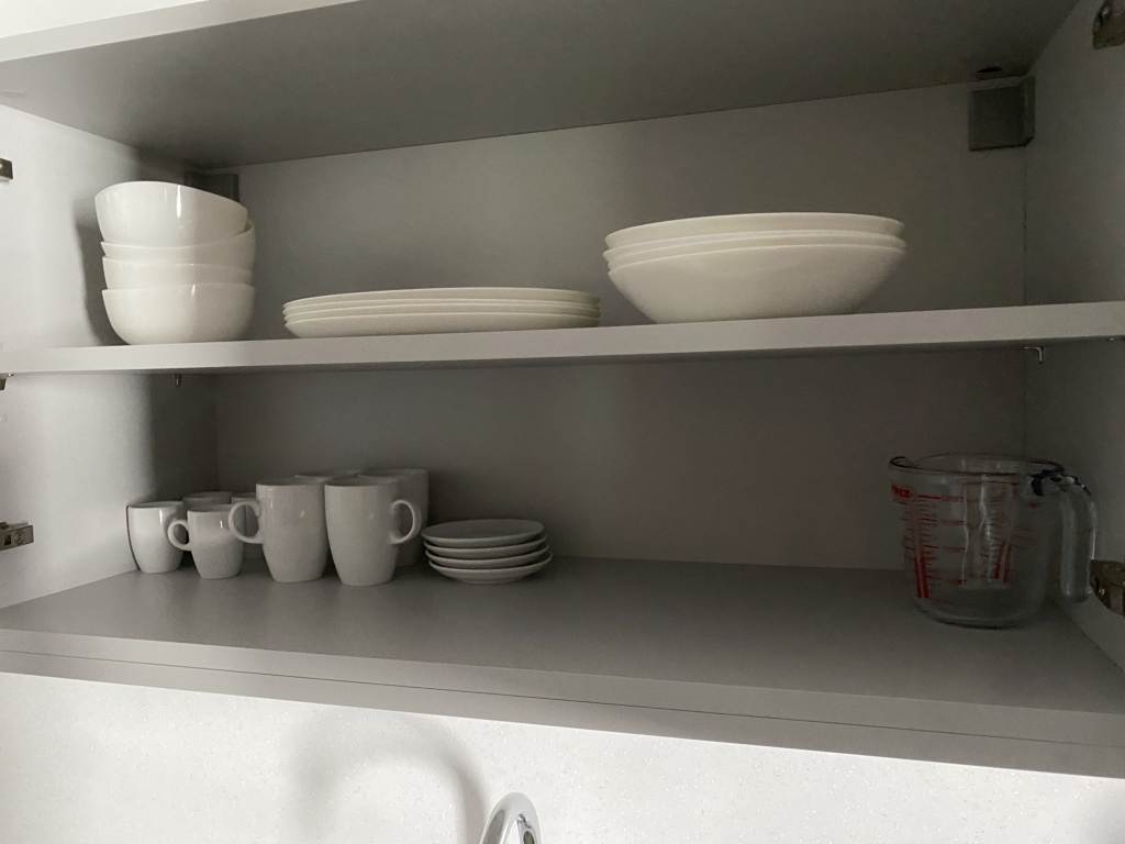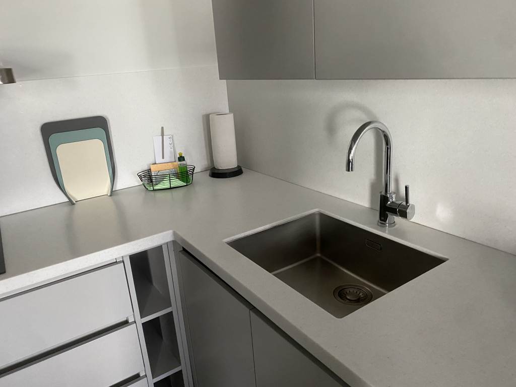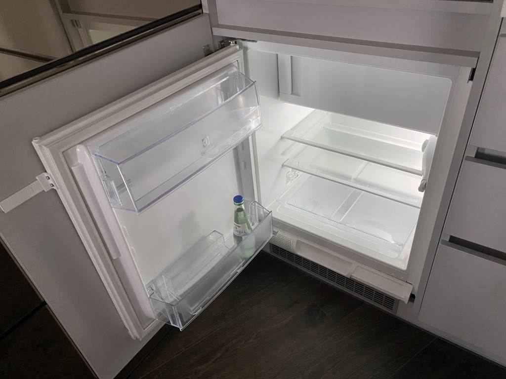 Die Küche selbst war ideal ausgestattet mit zwei Herdplatten, Mikrowelle, Spüle und Kühlschrank mit Eisfach. Selbst eine Spülmaschine war vorhanden. Während im Kühlschrank eine Flasche Wasser zur Begrüßung auf uns wartete, waren die Schränke mit allem ausgestattet, was man so im Alltag in der Küche benötigt. Von Geschirr und Besteck über Töpfe bis hin zu Gläsern, Frischhalte-Dosen und einem Flaschenöffner. Für Instant-Kaffee und Tee stand ein Wasserkocher zur Verfügung.