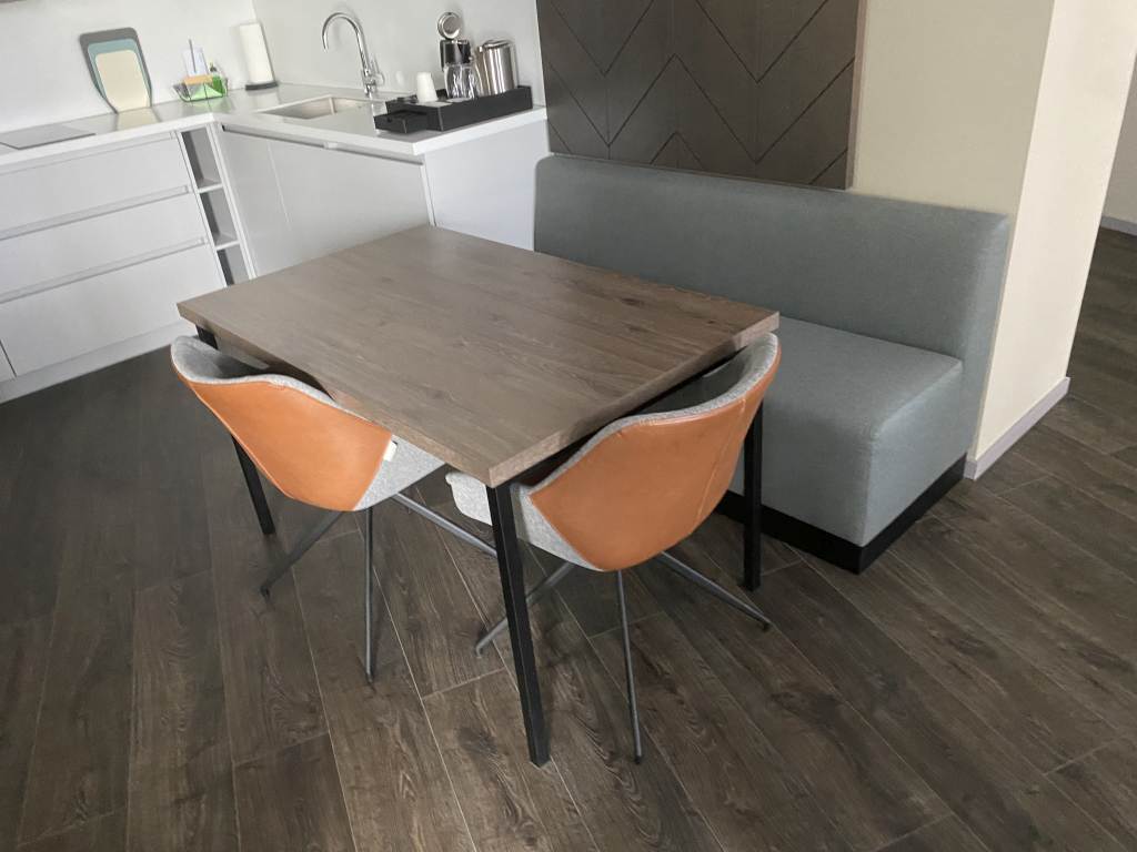 Unser Corner Studio 421 lag direkt in der Nähe des Aufzugs auf der 4. Etage des Residence Inn Essen. Nach öffnen der Tür mit der digitalen Zugangskarte begrüßte uns ein mehr als großzügiger Wohn-, Ess-, Arbeits- und Kochbereich. Der Arbeitsbereich mit Schreibtisch und einem Stuhl befindet sich im ersten Teil des Raumes. Hier ist auch ein erster großer Flachbild-Fernseher an der Wand angebracht, der sich in diversen Winkeln verstellen lässt. Direkt daneben an der Fensterfront steht das ausziehbare Sofa, auf dem locker zwei Personen schlafen können. Zwischen dem Wohn- und Arbeitsbereich und der Küche gab es noch einen großen Esstisch mit einer Bank und zwei Stühlen.