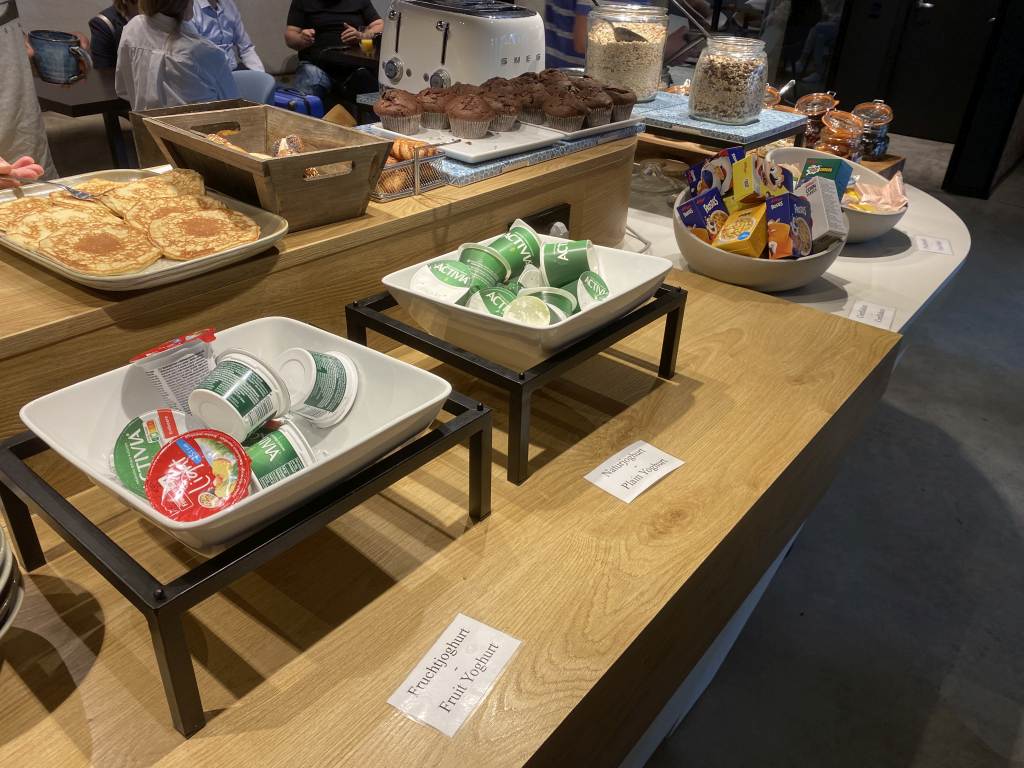 Das Frühstück wird im Residence Inn Essen täglich von 6:30 bis 10:30 Uhr serviert. Das Frühstücks-Büffet befindet sich etwas tiefer gelegen hinter der Rezeption. Die Anzahl an Tischen ist überschaubar und für die Stoßzeiten steht noch ein Nebenraum mit vier Tischen zur Verfügung. Trotzdem wurde es zur „Prime-Time“ doch so voll, dass Gäste auf freie Tische warten mussten.