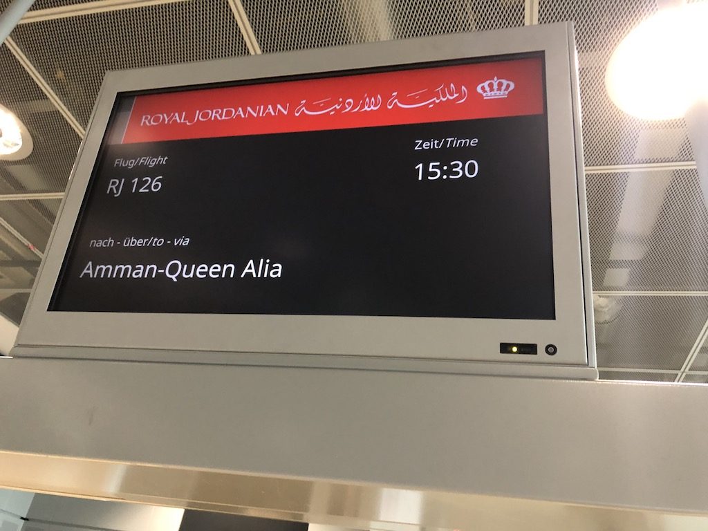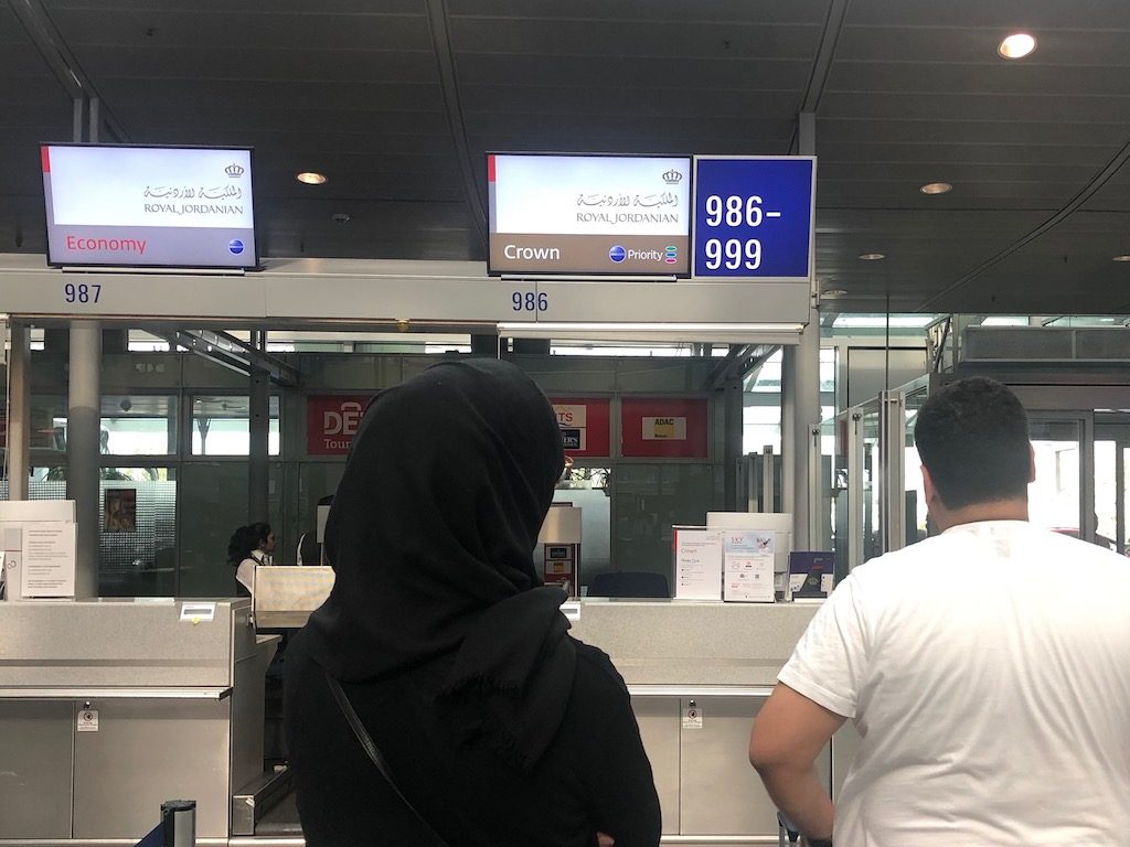 Exakt drei Stunden vor Abflug erreichte ich das Terminal 2 am Frankfurter Flughafen – Punktlandung, denn genau da wurde der Check-In für den Flug geöffnet. Zu diesem Zeitpunkt standen schon einige Passagiere in der Schlange, ein separater Schalter war für „Crown“ vorbehalten, so nennt Royal Jordanian ihre Business Class. Oneworld-Statuskarteninhaber konnten diesen natürlich auch nutzen.