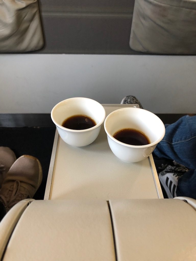 Noch am Boden wurden uns in kleinen Schälchen arabischer Kaffee mit Kardamom serviert. Die charmante Stewardess verteilte die Menükarten und fragte kurze Zeit später die Hauptgänge ab. Mein im British Airways Profil abgespeicherter Essenswunsch wurde sogar übermittelt, die nette Dame meinte aber, dass ich auch gerne aus der regulären Karte wählen könne.