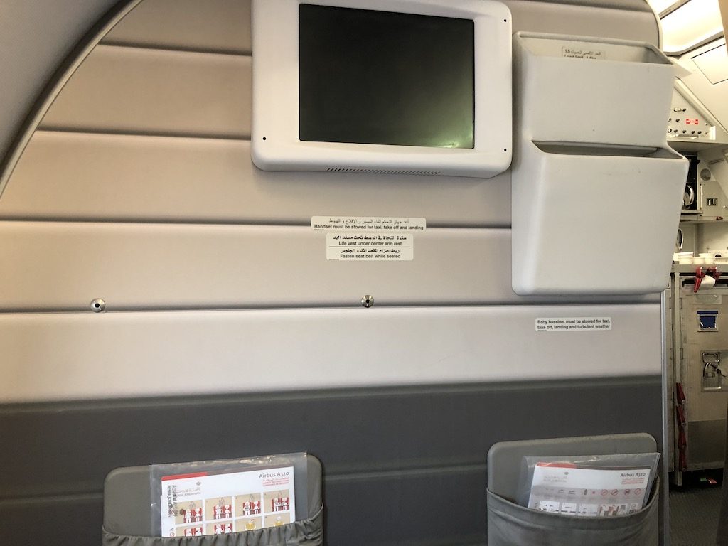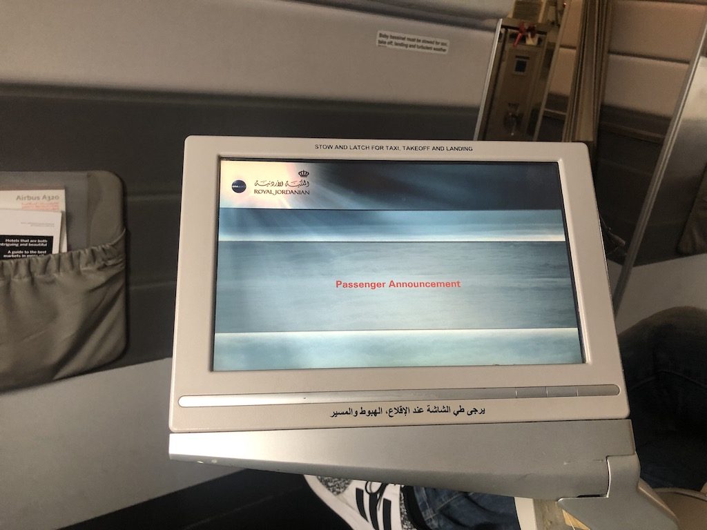 Eine Flugbegleiterin in traditionellem Gewand begrüßte uns freundlich. Trotz der Nähe zur Bordküche entschied ich mich für Sitze der ersten Reihe. Der Abflug ist in Frankfurt nachmittags und daher bestand kein allzu großes Bedürfnis nach Schlaf. Die Crown Class ist auf dem A320 mit einer 2-2 Bestuhlung in vier Reihen versehen, maximal finden also 16 Gäste Platz. Einige Sitze blieben diesmal frei, sicher schön für Alleinreisende und auch für die Crew, die an einem Tag den Hin- und Rückflug aus Amman meisterte.