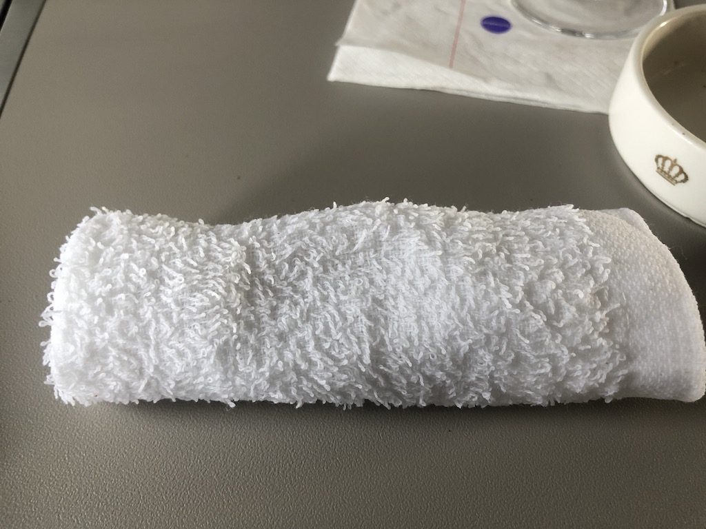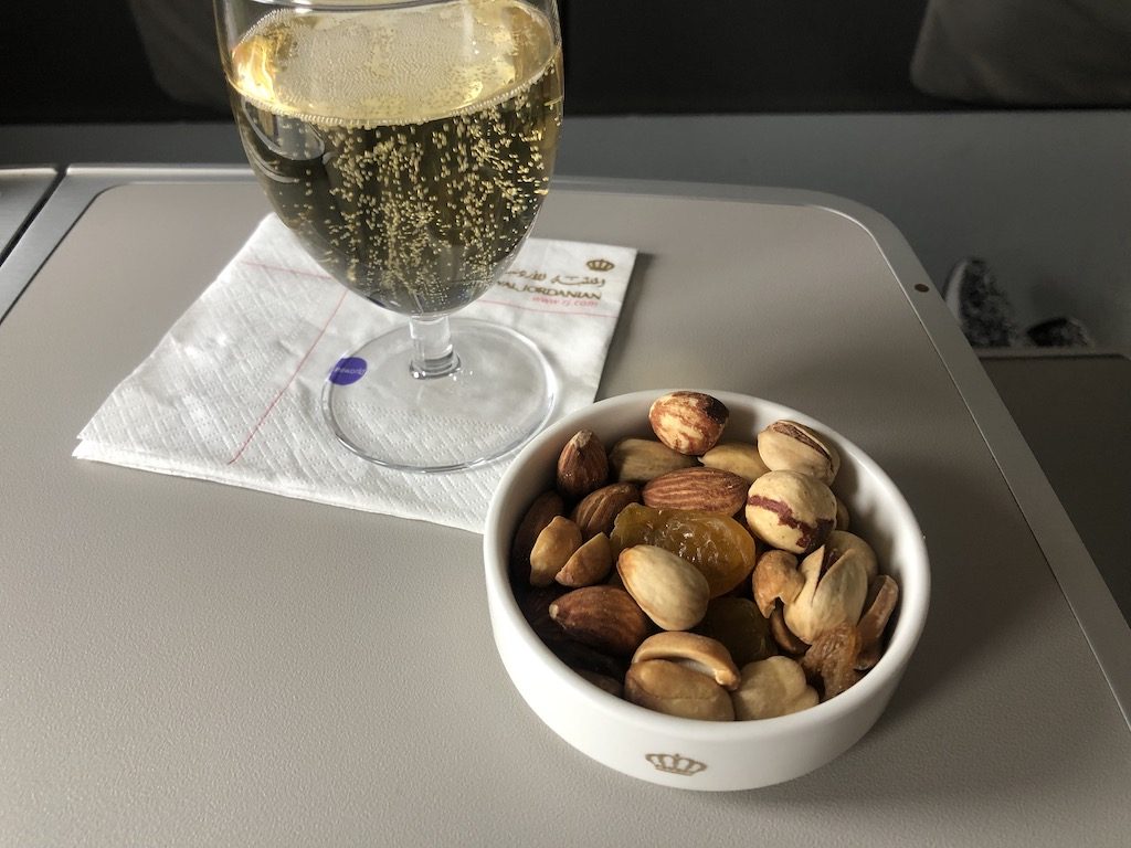 Nach dem Start ging es zügig mit dem Service los, der Purser war ausschließlich in der Galley tätig und bereitete alles vor. Eine Flugbegleiterin war nur für die Passagiere in der Crown-Class zuständig und häufig in der Kabine zu sehen. Der Aperitif wurde mit gemischten Nüssen serviert, ein heißes Tuch folgte.