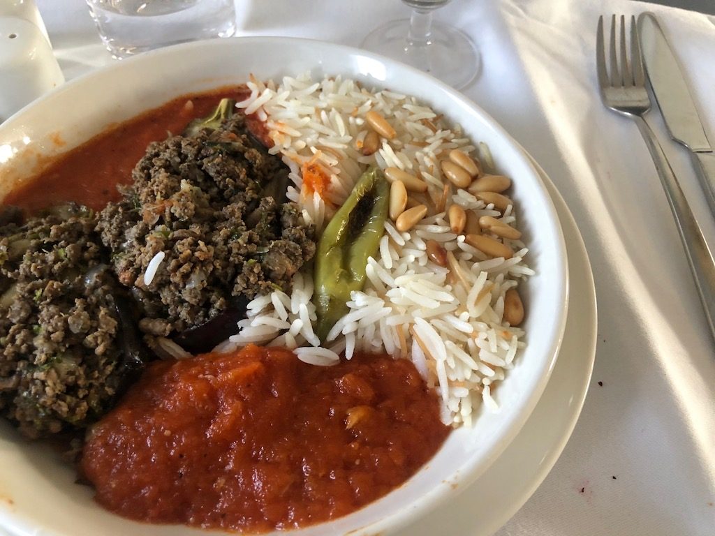 Als Vorspeisen standen eine westliche Platte oder arabische Mezze zur Wahl. Eine wunderbare Einstimmung auf das Ziel, wenn lokale Spezialitäten angeboten werden, für mich waren Mezze also gesetzt. Danach kamen Auberginen und Hackfleisch mit orientalischen Gewürzen.