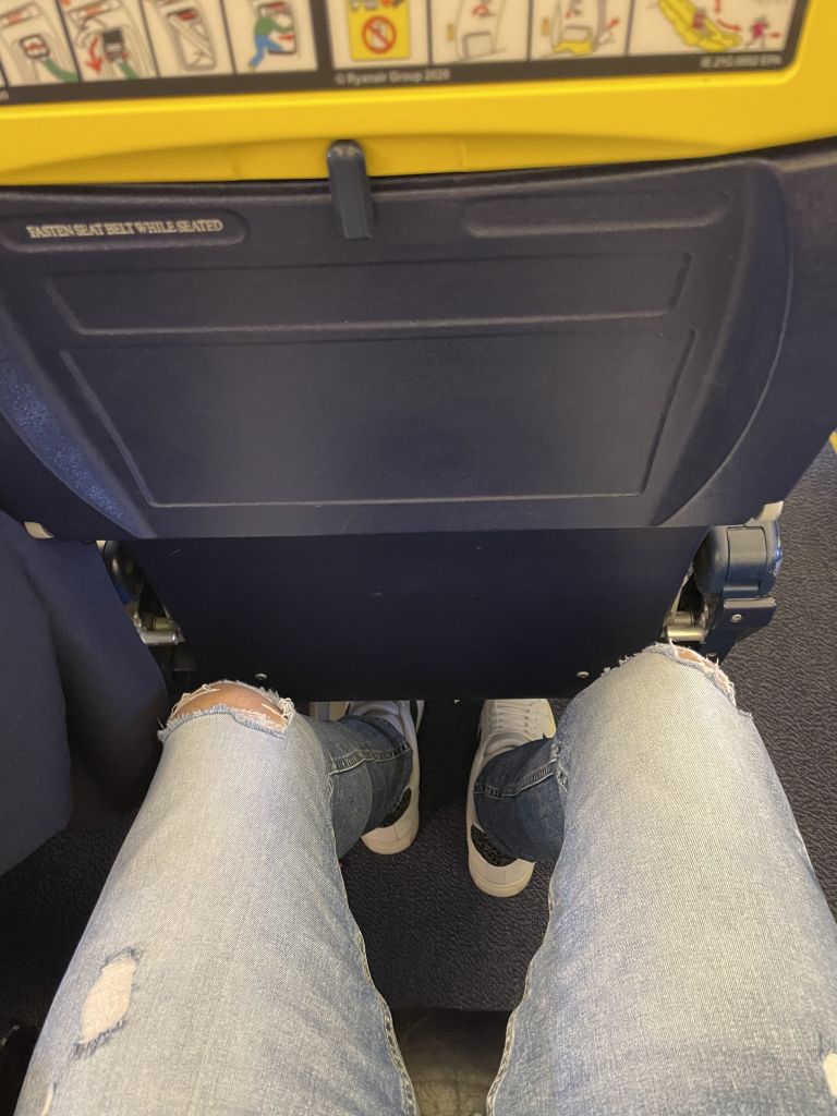 Insgesamt finden so bis zu 189 Passagiere an Bord einer Ryanair Boeing 737-800 Platz. Und während der Sitzabstand von 30 (normale Sitzreihe) und 32-34 Zoll (bevorzugte Sitzplätze) gar nicht mal so viel klingt, fand ich mit meinen 1,85 Metern ausreichend Beinfreiheit in Reihe 7 vor.