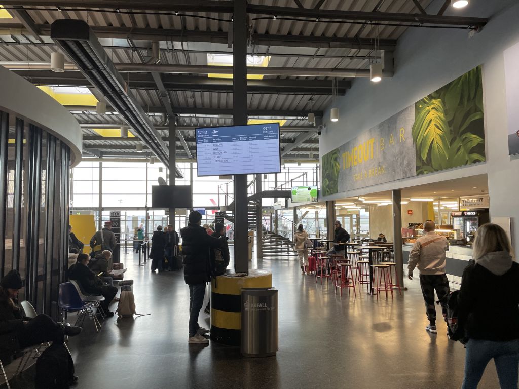 Ich habe immer Fragezeichen, wenn ich am Flughafen Bremen etwas von Terminal 1 und 2 lese. Scheinbar gibt es sogar ein Terminal 3 (wo soll das bitte sein und wofür?). Als ich zum Terminal zurück ging, sah ich zum ersten Mal den Eingang von Terminal 2. Wobei besser gesagt Ausgang, da alle Abflüge über Terminal 1 abgefertigt werden. Airside gelangten wir dann nach schneller Sicherheitskontrolle und kurzem Besuch in der „The Lounge Bremen“ über verwinkelte Gänge tatsächlich noch zu einem anderen Terminal. Und das sah extra wie für Ryanair gebaut aus. Wie die alte Baumarkt-Halle am Flughafen Tegel.