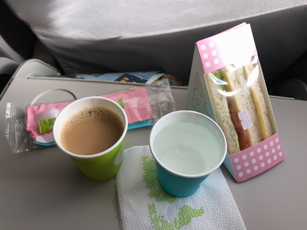 Rund 30 Minuten nach dem Start wurde durch die Crew eine Getränkerunde, allerdings nur mit alkoholfreien Getränken, angeboten. Dazu gab es ein Sandwich, bei dem man die Wahl zwischen „Hähnchen oder Käse“ hatte. Ich entschied mich für die zweite Option.