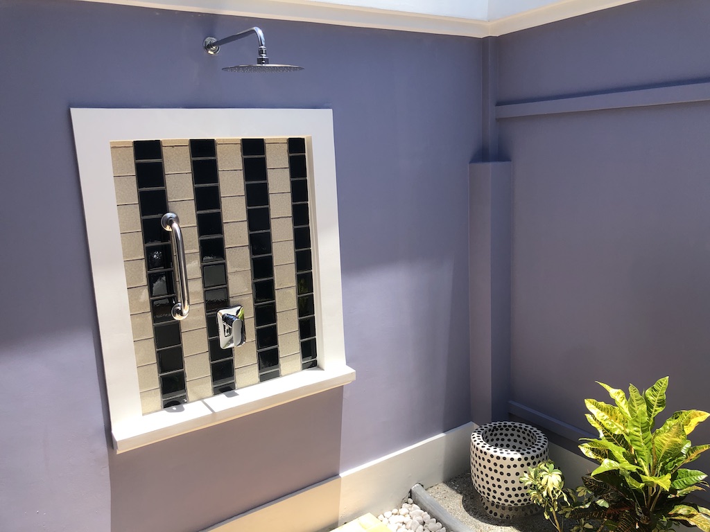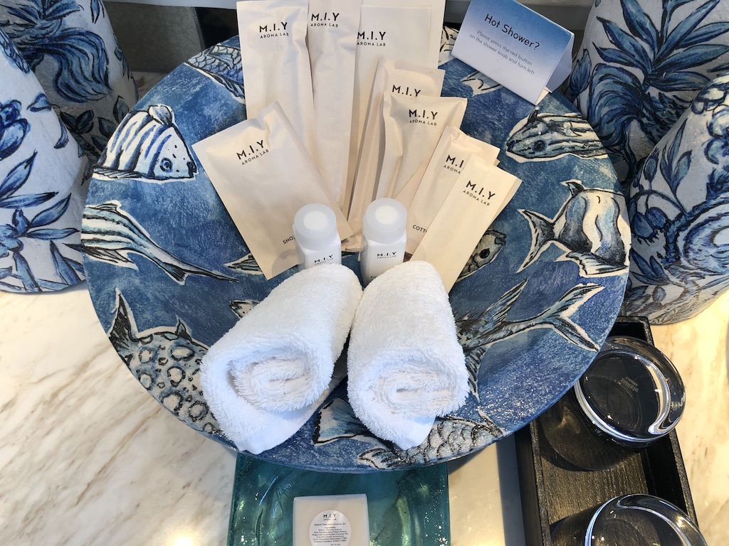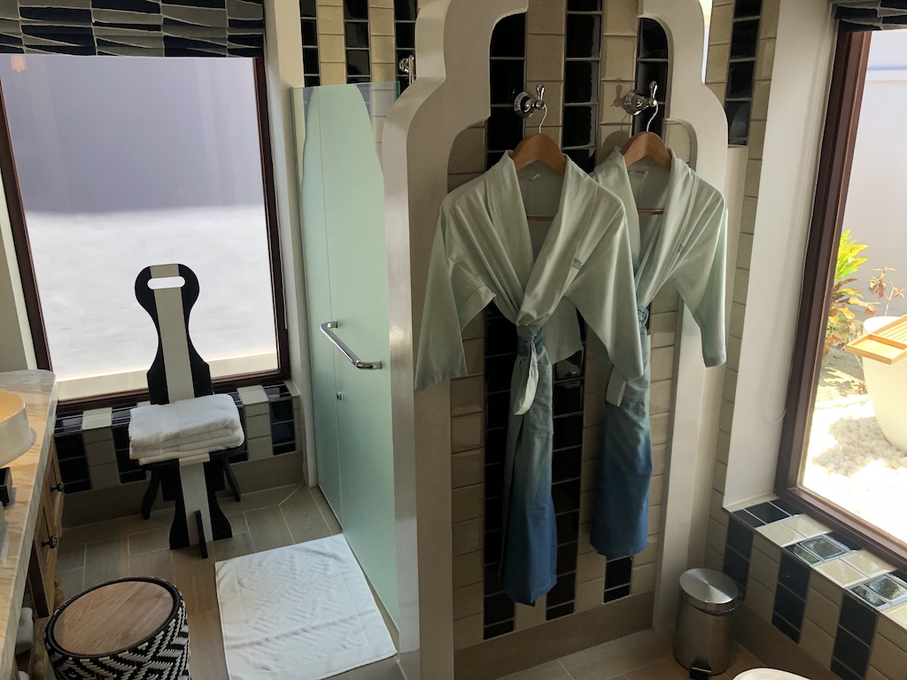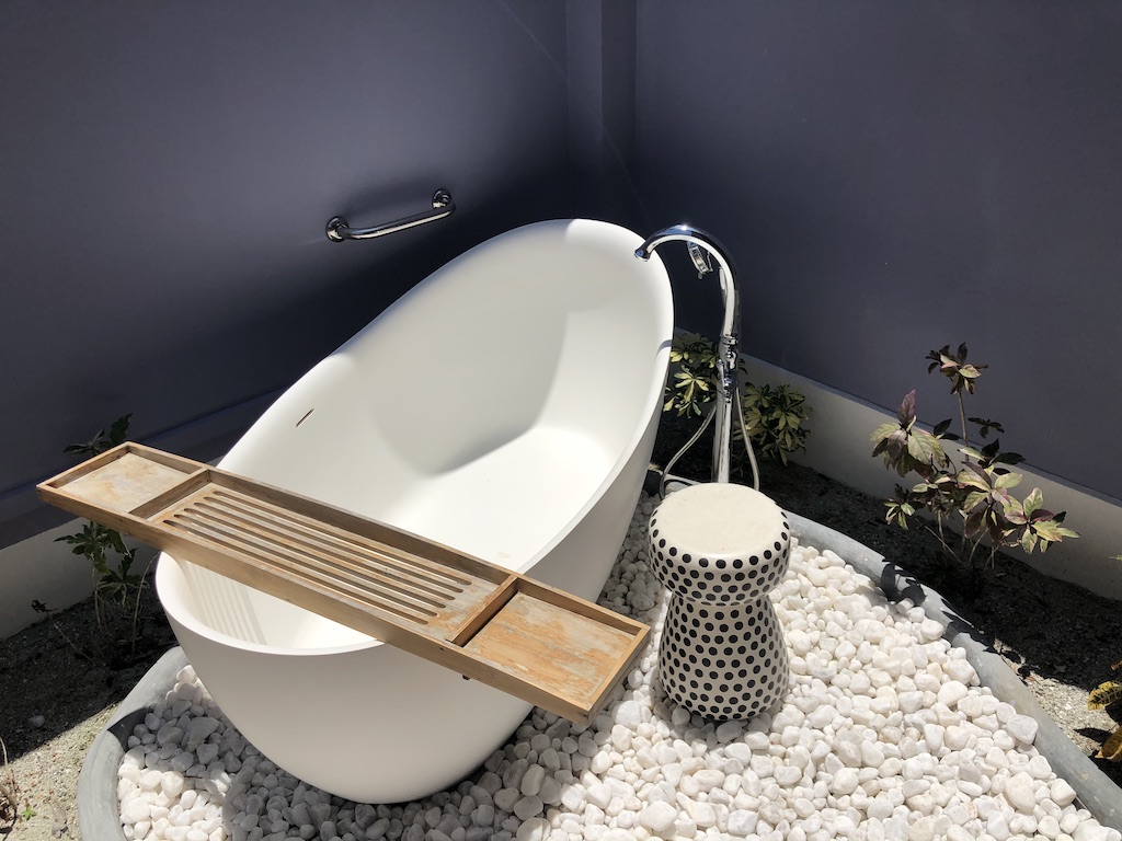 Von dort gelangt man allerdings in ein einen Außenbereich mit Badewanne und einer weiteren Dusche unter freiem Himmel. Zahlreiche Pflegeprodukte stehen zur freien Verfügung.