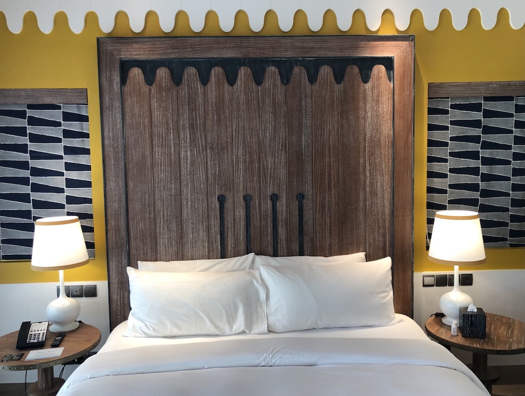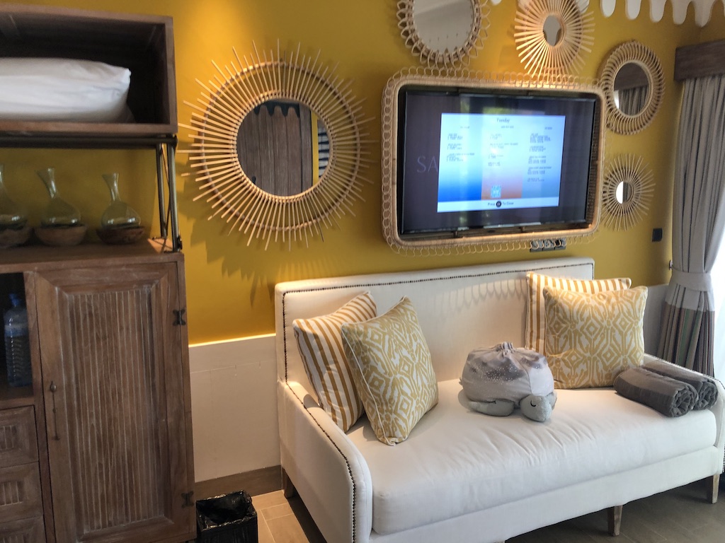 Die Zimmer sind alle im identischen Design gehalten, das Bett steht im Mittelpunkt. Über einem Sofa ist ein großer Fernseher mit einigen Optionen wie Zimmerservice oder Einblick in die Rechnung. Es gibt zusätzlich zur Klimaanlage auch einen Deckenventilator, indirekte Beleuchtung, ausreichend Steckdosen und USB-Schnittstellen.