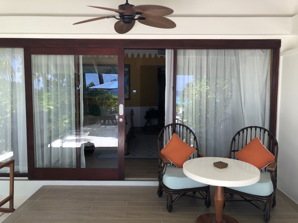 Auf der Terrasse sind weitere Sitzgelegenheiten mit Tisch und zwei Sonnenliegen mit Schirm zu finden. Zum Meer sind es nur noch einige Schritte. Ende April war das Hotel nur schwach ausgelastet, die Privatsphäre war extrem hoch.
