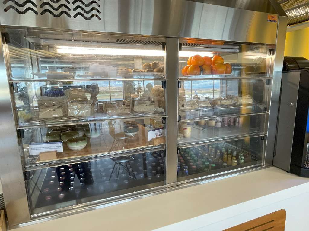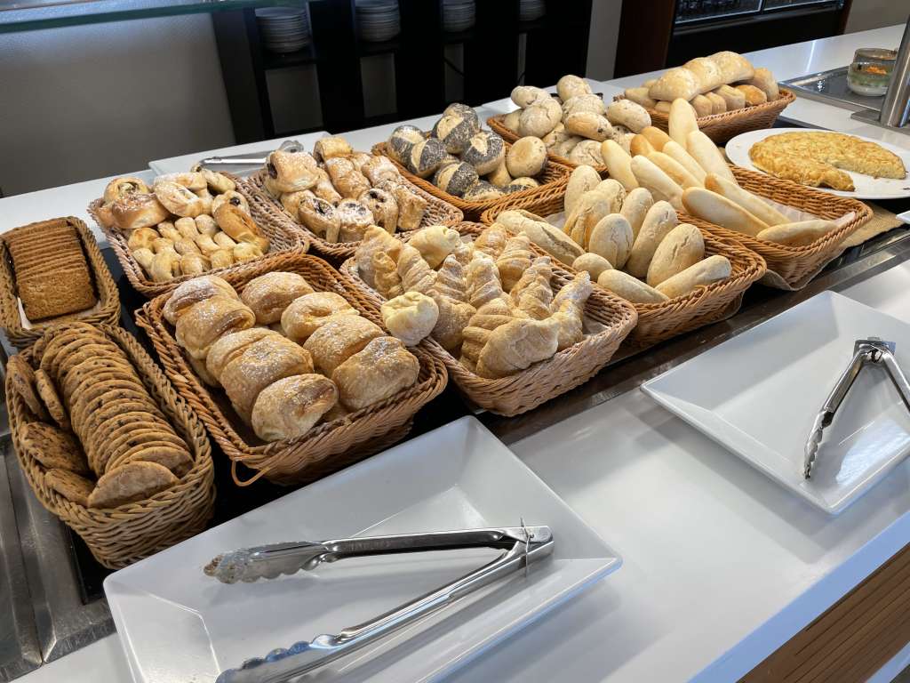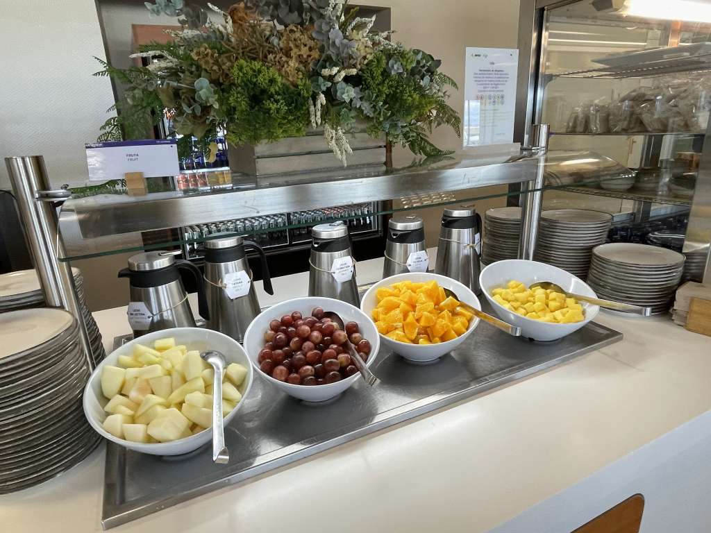 Das galt auch für zwei Optionen an Salaten. Im Gegensatz zum Obst, welches es in großen Schüsseln am Buffet gab. Umfangreich war das Angebot an Brötchen und süßen Backwaren, welches von den gewohnten abgepackten Sandwiches ergänzt wird. Nie fehlten auch salzige Snacks und Joghurts.
