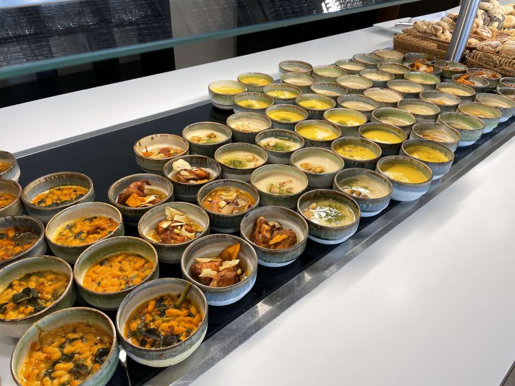 In meinen zahlreichen Reviews zu den Lounges an spanischen Flughäfen habe ich immer wieder auf das Manko aufmerksam gemacht, dass das Angebot an Speisen sehr schnell eintönig wird. Besonders zur Frühstückszeit gleichen sich die vielen Lounges doch sehr, egal von wo man gerade abfliegt. Im Sala VIP Puerta de Alcalá war ich nachmittags und konnte so das Angebot auch an warmen Speisen testen. Dabei waren glücklicherweise auch abwechslungsreiche Optionen, wie Hähnchen mit Zitrone und Rosinen. Alle warmen Gerichte inklusive der Suppen wurden in kleinen Portionen präsentiert.