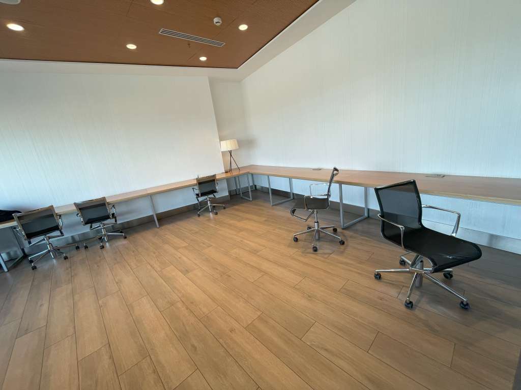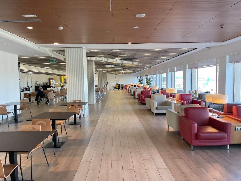 Der Empfang der Lounge wirkt unscheinbar. Doch dahinter eröffnet sich ein großer Saal mit zahlreichen Sitzgelegenheiten und einer zentralen Buffet-Station. An den Enden des langgezogenen Saals, der dank einer breiten Fensterfront hervorragende Blicke auf das Vorfeld bietet, befinden sich zwei weitere Räume. Am Ende der Lounge ist durch eine Glasfront ein Arbeitsbereich mit Schreibtischen und einem Konferenztisch untergebracht. Im vorderen Teil befindet sich eine Art TV-Zimmer mit bequemen Loungemöbeln.