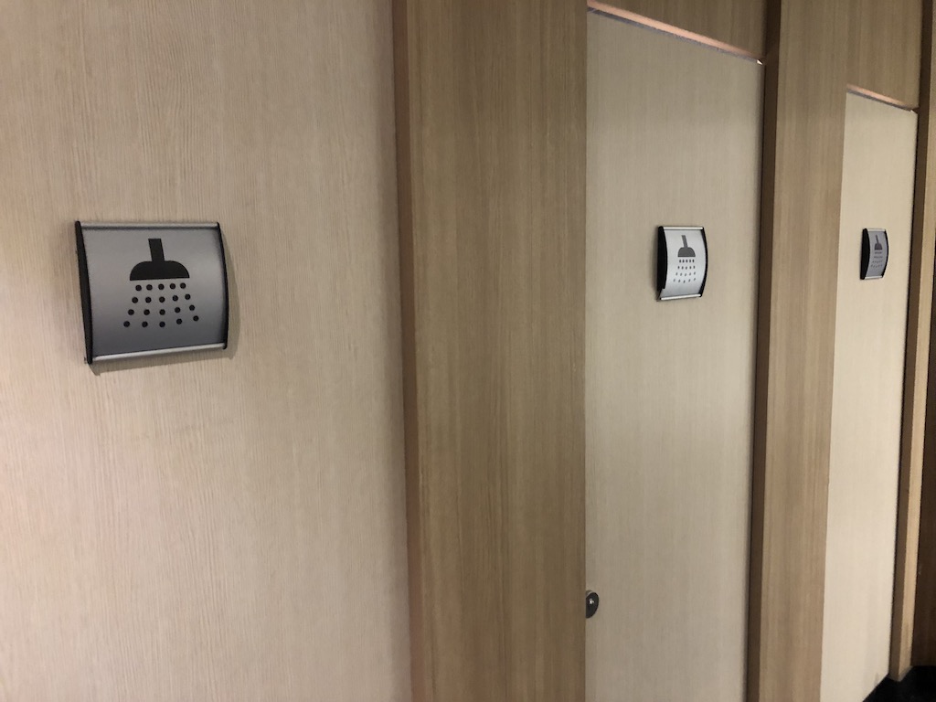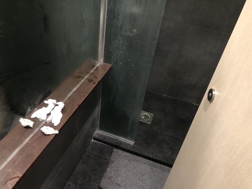 Nach der Enttäuschung am warmen Buffet folgte die nächste sogleich im Sanitärbereich der Lounge. Hier wurden drei Duschen angeboten, für deren Nutzung am Empfang auch Handtücher ausgegeben wurden. Die Hygiene der Toiletten und Duschen war jedoch als katastrophal zu bezeichnen. Die Duschkabinen waren allesamt schmutzig, teils lag Plastikmüll von verpackten Hygieneartikeln herum. Auch eine Reinigungskraft war weit und breit nicht zu sehen. Hier wurde geradezu eine Gleichgültigkeit durch den Betreiber gegenüber seinen Besuchern suggeriert.