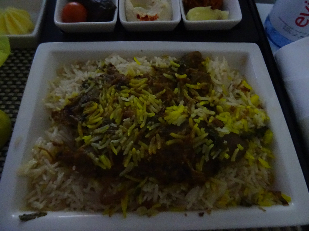 Auf dem langen Flug von neun Stunden werden zwei Mahlzeiten ausgeteilt. Am Anfang stellte sich das für mich verantwortliche Crew-Mitglied vor und fragte nach dem Essen, das ich zu mir nehmen wollte. Die Mahlzeiten selbst durfte ich dann einnehmen, wenn es mir am besten gepasst hat.