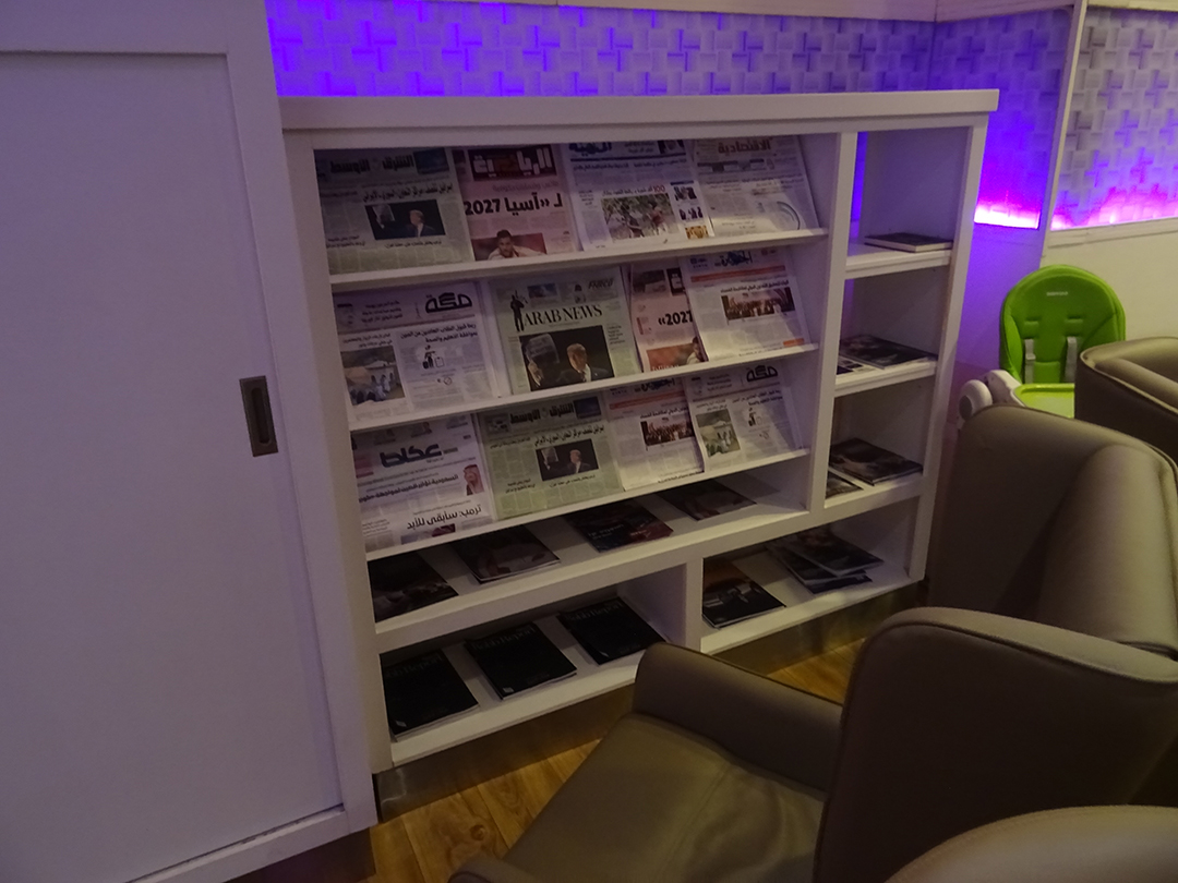 Wie in Lounges üblich, stehen auch in dieser Bildschirme mit anstehenden Abflügen zur Verfügung. Diese zeigen Flüge abwechselnd in den Sprachen arabisch und englisch an – alternativ helfen Euch die Mitarbeiter gerne weiter. In der Nähe des Eingangs befindet sich auch eine Leseecke mit Zeitungen.