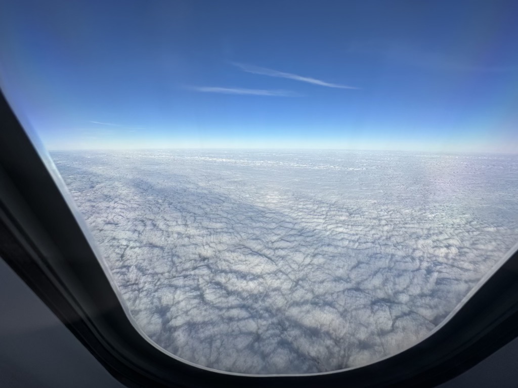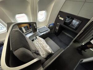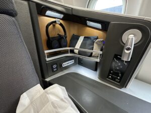 Der Sitzabstand war mehr als ausreichend und genau so, dass man angenehm aus dem Fenster schauen konnte. Am Sitz findet Ihr eure Noise-Cancelling Kopfhörer, ein Amenity Kit und eine Wasserflasche vor. Natürlich bekommt Ihr auch ein gut gefülltes Kissen, eine dicke Decke und ein Sitzschoner und die Liegefunktion des Sitzes richtig genießen zu können. Der Tisch war in der Seite versteckt und mehr als Ausreichen groß proportioniert. Wer arbeiten möchte, sollte aber eher ein Platz in den ungeraden reihen nehmen, denn da kann man seitlich aufstehen. Auf dem Rückflug auf Platz 4A musste ich immer alle Dinge zusammen räumen, um den Sitz verlassen zu können.