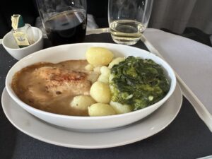 Die Vorspeise, bestehend aus einem Blumenkohlpüree mit Carpaccio und einem Kräutersalat bot den perfekten Auftakt und wurde im Anschluss von einem Hühnchen in Pilzsoße noch mal übertroffen. Geschmacklich habe ich in den letzten Jahren nichts vergleichbar leckeres im Flugzeug gegessen. Meine Verunsicherung war also in keiner Weise gerechtfertigt. Auch das Dessert war überaus lecker und wurde im Verlauf des Fluges erneut zum Kaffee angeboten.