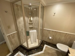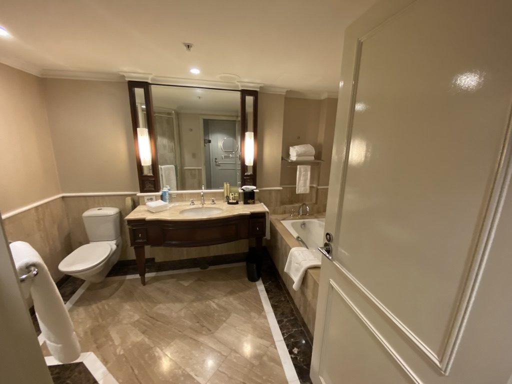 Wenn Ihr das Zimmer betretet, steht Ihr zunächst in Eurem Flur, von welchem auf der linken Seite das Bad abgeht. Der erste Eindruck des Bades war: „Altbacken“, jedoch war das Bad in einem top Zustand und wirklich groß. Im Bad findet Ihr eine großzügige Dusche und auch eine Badewanne.