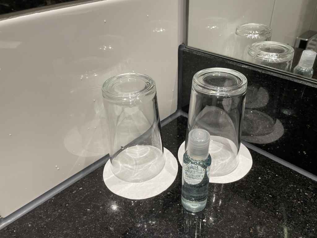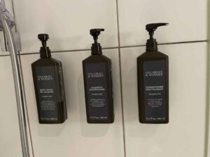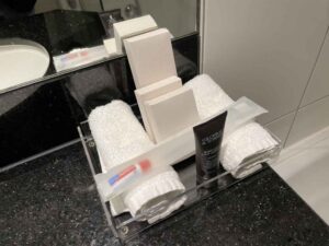 Pflegeprodukte kommen aus dem Spender und sind aus der Produktlinie Warm Oakes von Gilchrist & Soames. Neben den Basic-Produkten wie Duschbad, Shampoo und Conditioner standen auch Body-Lotion, Zahnbürste, Rasierer und co. zur Verfügung.